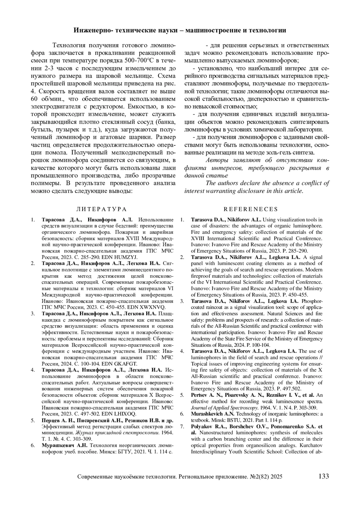 1. Тарасова Д.А., Никифоров А.Л. Использование средств визуализации в случае бедствий: преимущества органического люминофора. Пожарная и аварийная безопасность: сборник материалов XVIII Международной научно-практической конференции. Иваново: Ивановская пожарно-спасательная академия ГПС МЧС России, 2023. С. 285-290. EDN HUMZYJ.