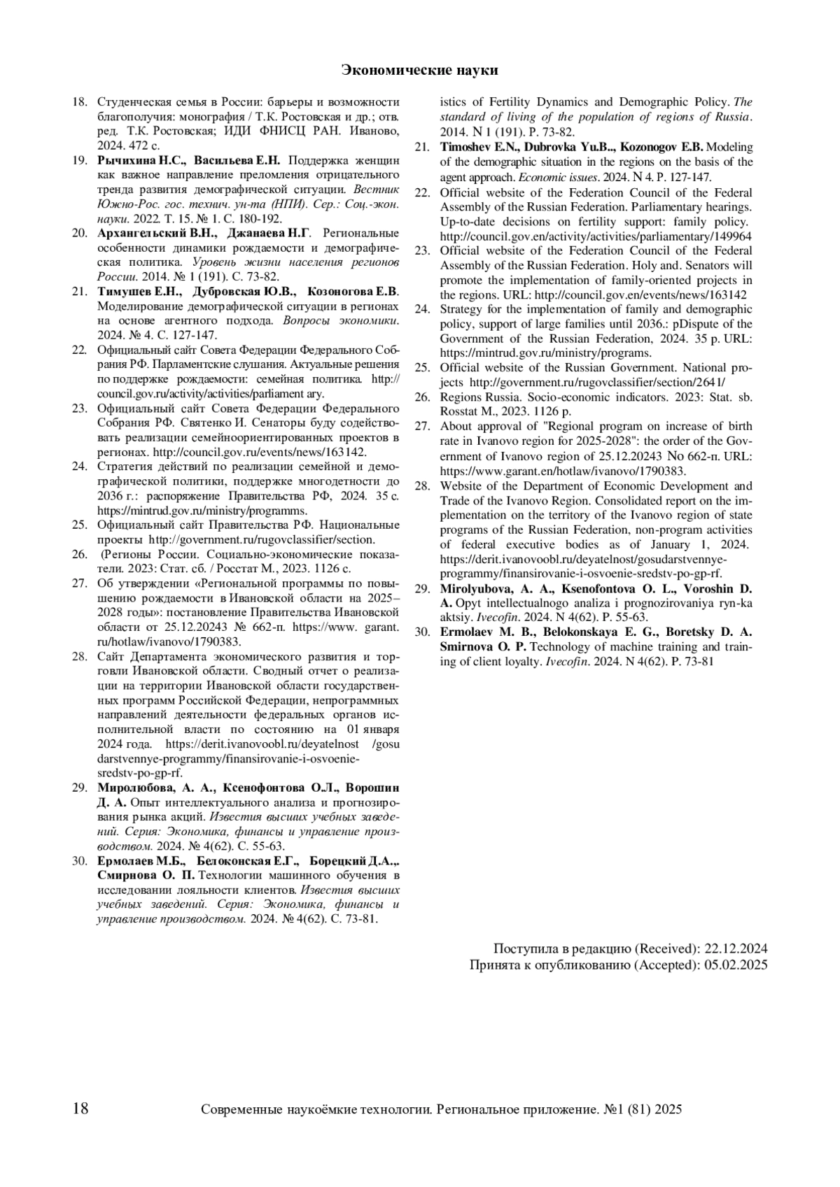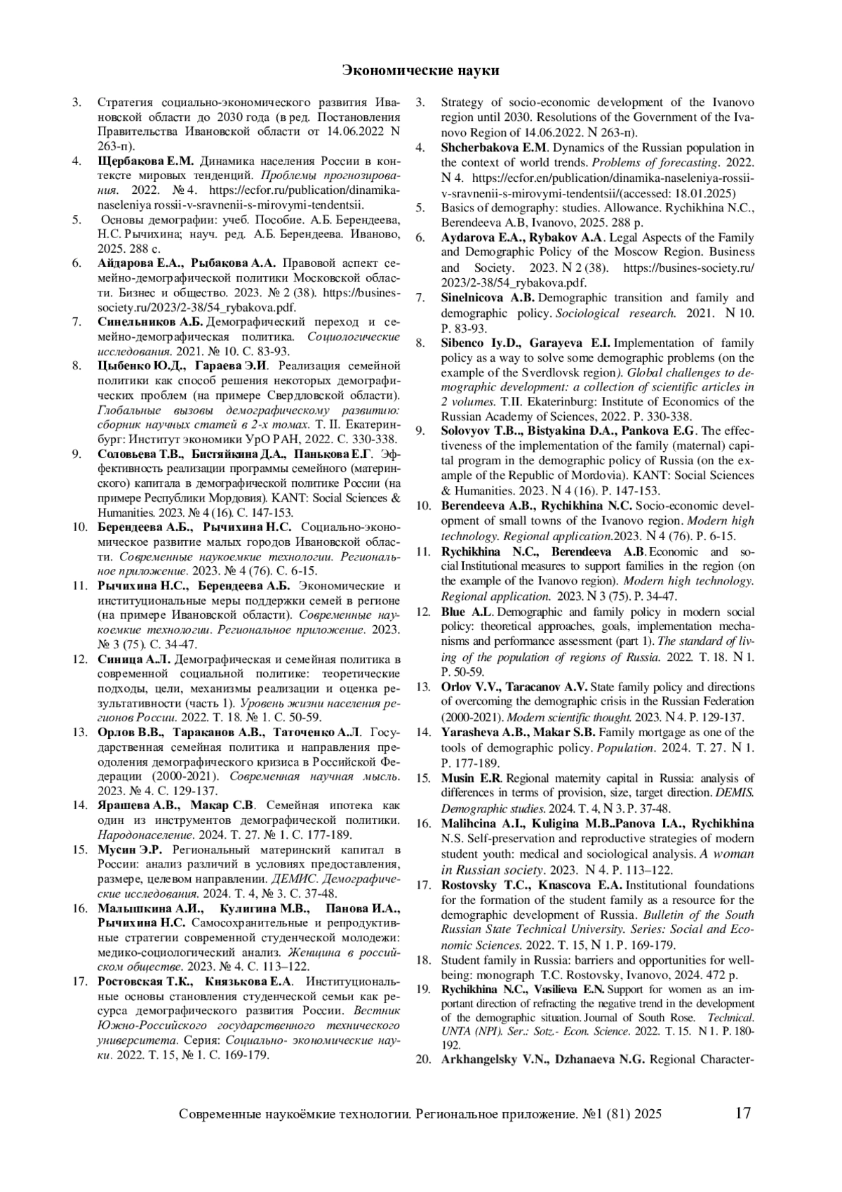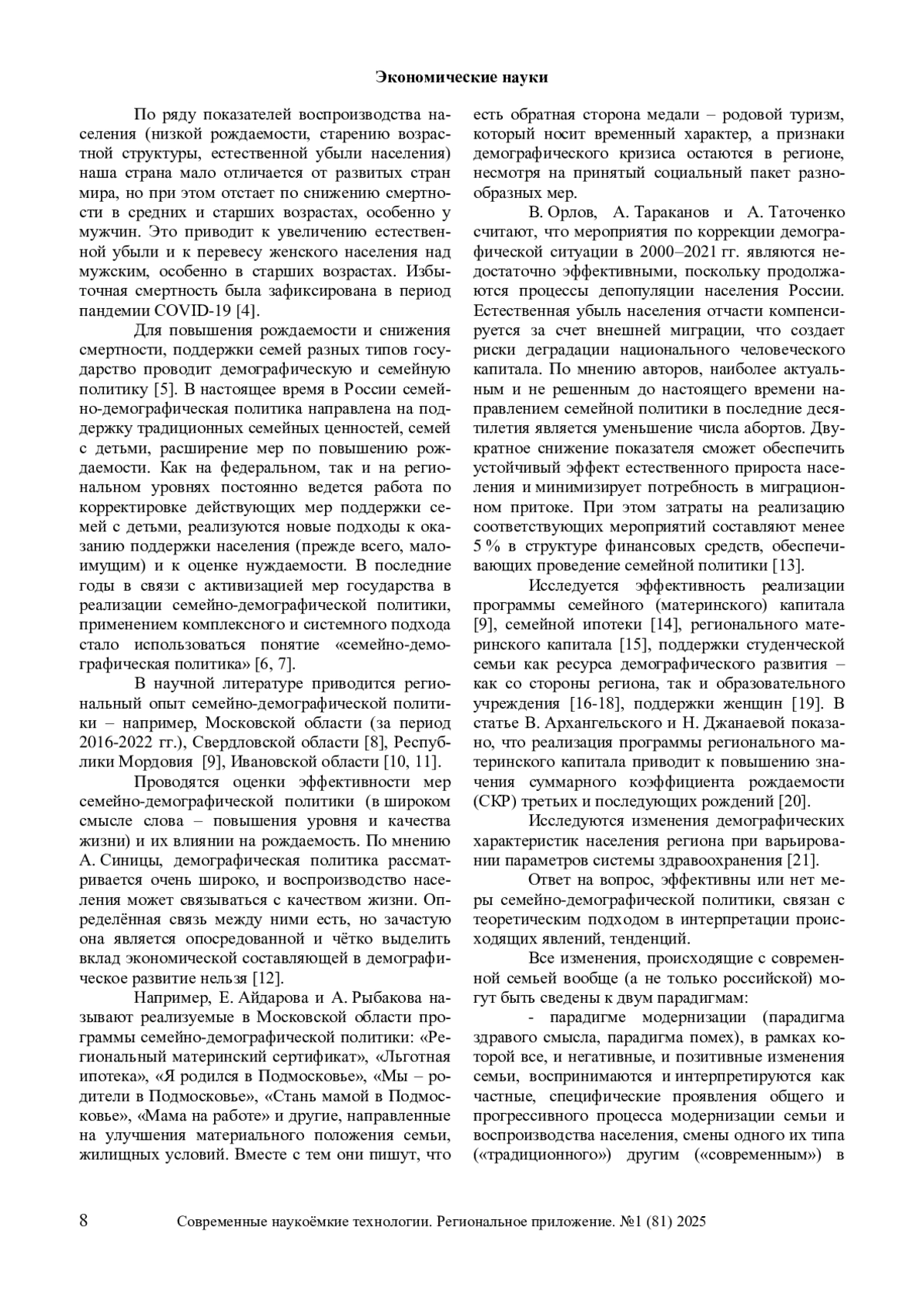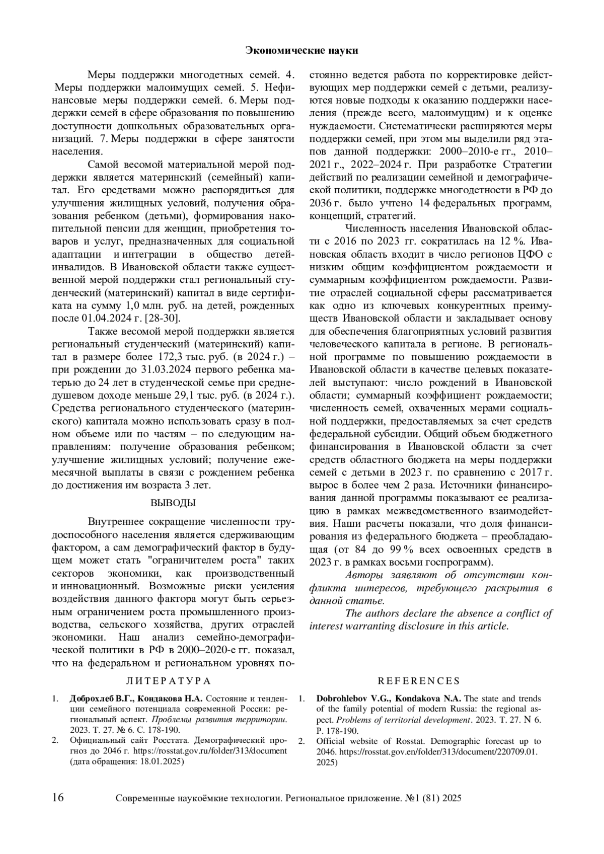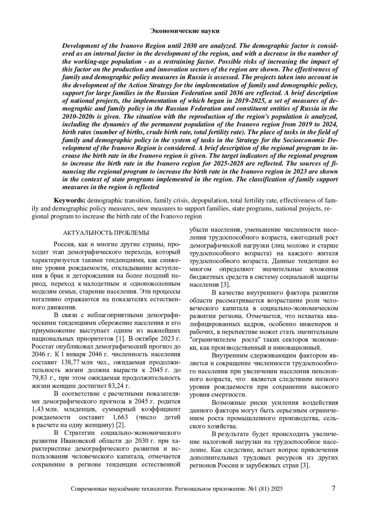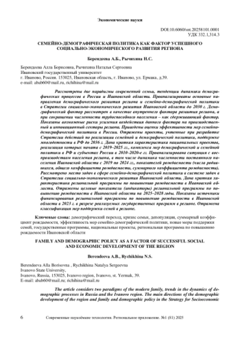 Рассмотрены две парадигмы современной семьи, тенденции динамики демографических процессов в России и Ивановской области. Проанализированы основные направления демографического развития региона и семейно-демографической политики в Стратегии социально-экономического развития Ивановской области до 2030 г. Демографический фактор рассмотрен в качестве внутреннего фактора развития региона, а при сокращении численности трудоспособного населения – как сдерживающий фактор. Показаны возможные риски усиления воздействия данного фактора на производственный и инновационный секторы региона. Приведены оценки эффективности мер семейно-демографической политики в России. Отражены проекты, учтенные при разработке Стратегии действий по реализации семейной и демографической политики, поддержке многодетности в РФ до 2036 г. Дана краткая характеристика национальных проектов, реализация которых начата с 2019–2025 гг., комплекса мер демографической и семейной политики в РФ и субъектах России в 2010–2020-е гг. Проанализирована ситуация с воспроизводством населения региона, в том числе динамика численности постоянного населения Ивановской области с 2019 по 2024 гг., показателей рождаемости (числа родившихся, общего коэффициента рождаемости, суммарного коэффициента рождаемости). Рассмотрено место задач в сфере семейно-демографической политики в системе задач в Стратегии социально-экономического развития Ивановской области. Дана краткая характеристика региональной программы по повышению рождаемости в Ивановской области. Отражены целевые показатели (индикаторы) региональной программы по повышению рождаемости в Ивановской области на 2025–2028 годы. Показаны источники финансирования региональной программы по повышению рождаемости в Ивановской области в 2023 г. в разрезе реализуемых государственных программ в регионе. Отражена классификация мер поддержки семей в регионе.