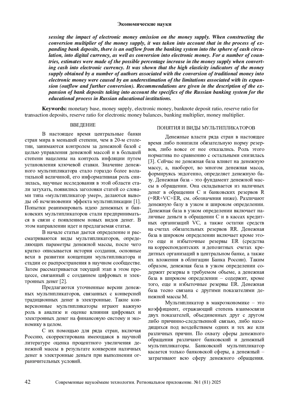 В настоящее время центральные банки стран мира в меньшей степени, чем в 20-м столетии, занимаются контролем за денежной базой с целью управления денежной массой и в большей степени нацелены на контроль инфляции путем установления ключевой ставки. Значение денежного мультипликатора стало гораздо более волатильной величиной, его информативная роль снизилась, научные исследования в этой области стали затухать, появились заголовки статей со словами типа «мультипликатор умер», делаются выводы об исчезновении эффекта мультипликации [1]. Попытки реанимировать идею денежных и банковских мультипликаторов стали предприниматься в связи с появлением новых видов денег. В этом направлении идет и предлагаемая статья