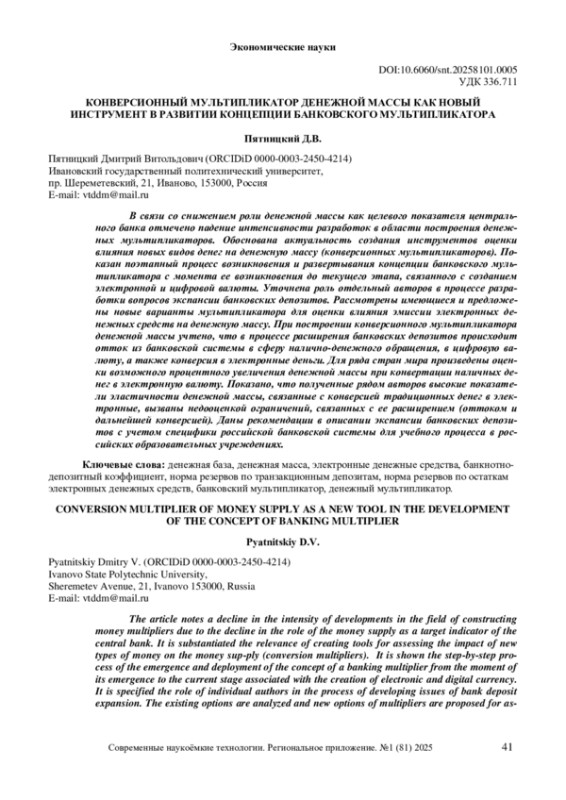 В связи со снижением роли денежной массы как целевого показателя центрального банка отмечено падение интенсивности разработок в области построения денежных мультипликаторов. Обоснована актуальность создания инструментов оценки влияния новых видов денег на денежную массу (конверсионных мультипликаторов). Показан поэтапный процесс возникновения и развертывания концепции банковского мультипликатора с момента ее возникновения до текущего этапа, связанного с созданием электронной и цифровой валюты. Уточнена роль отдельный авторов в процессе разработки вопросов экспансии банковских депозитов. Рассмотрены имеющиеся и предложены новые варианты мультипликатора для оценки влияния эмиссии электронных денежных средств на денежную массу. При построении конверсионного мультипликатора денежной массы учтено, что в процессе расширения банковских депозитов происходит отток из банковской системы в сферу налично-денежного обращения, в цифровую валюту, а также конверсия в электронные деньги. Для ряда стран мира произведены оценки возможного процентного увеличения денежной массы при конвертации наличных денег в электронную валюту. Показано, что полученные рядом авторов высокие показатели эластичности денежной массы, связанные с конверсией традиционных денег в электронные, вызваны недооценкой ограничений, связанных с ее расширением (оттоком и дальнейшей конверсией). Даны рекомендации в описании экспансии банковских депозитов с учетом специфики российской банковской системы для учебного процесса в российских образовательных учреждениях.