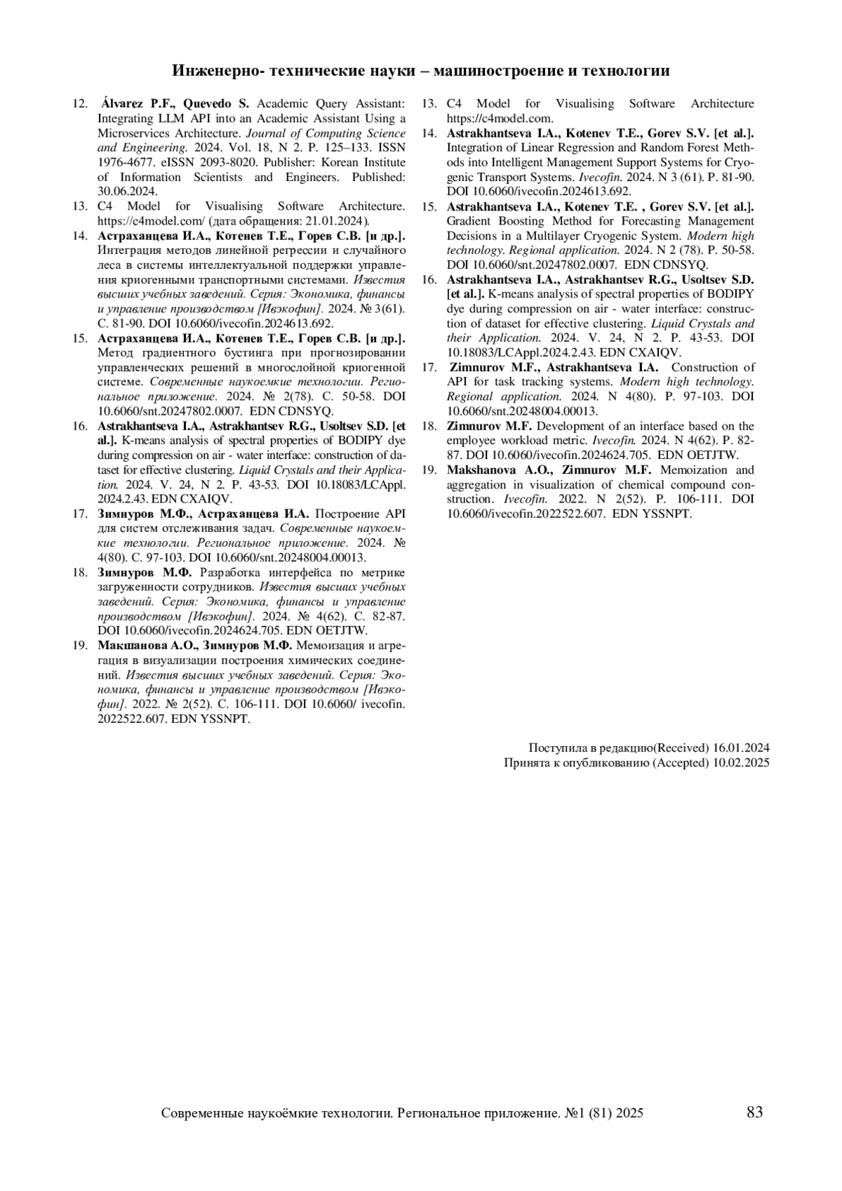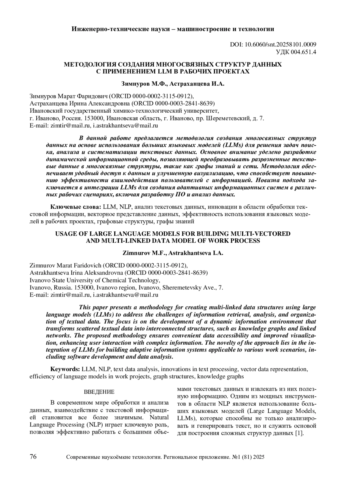 9. Грибова В.В., Переволоцкий В.С. Разработка графов знаний на основе больших языковых моделей для поддержки принятия решений в медицине. Программная инженерия. 2024. Т. 15, № 6. С. 308-321. УДК 004.89. ISSN 2220-3397.