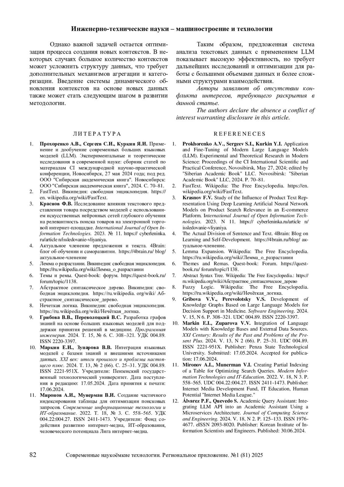 1. Прохоренко А.В., Сергеев С.И., Куркин Я.И Применение и дообучение современных больших языковых моделей (LLM). Экспериментальные и теоретические исследования в современной науке: сборник статей по материалам CI международной научно-практической конференции, Новосибирск, 27 мая 2024 года; под ред. ООО “Сибирская академическая книга”. Новосибирск: ООО “Сибирская академическая книга”, 2024. С. 70-81.
