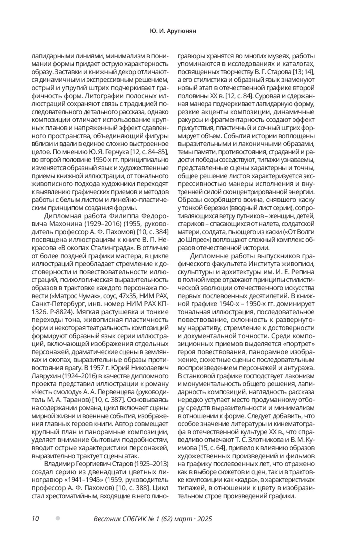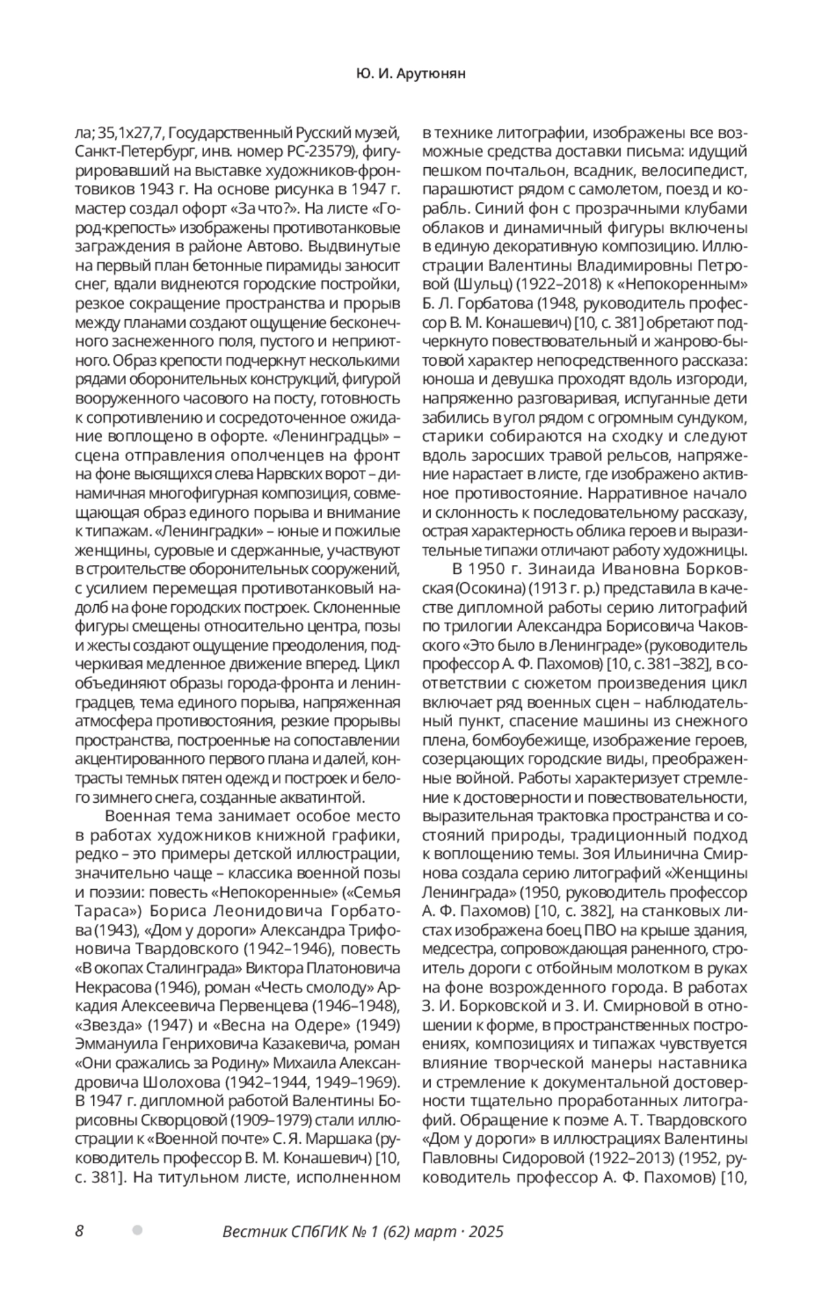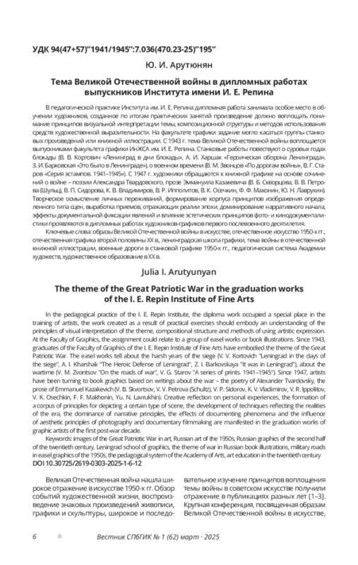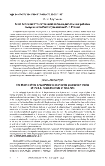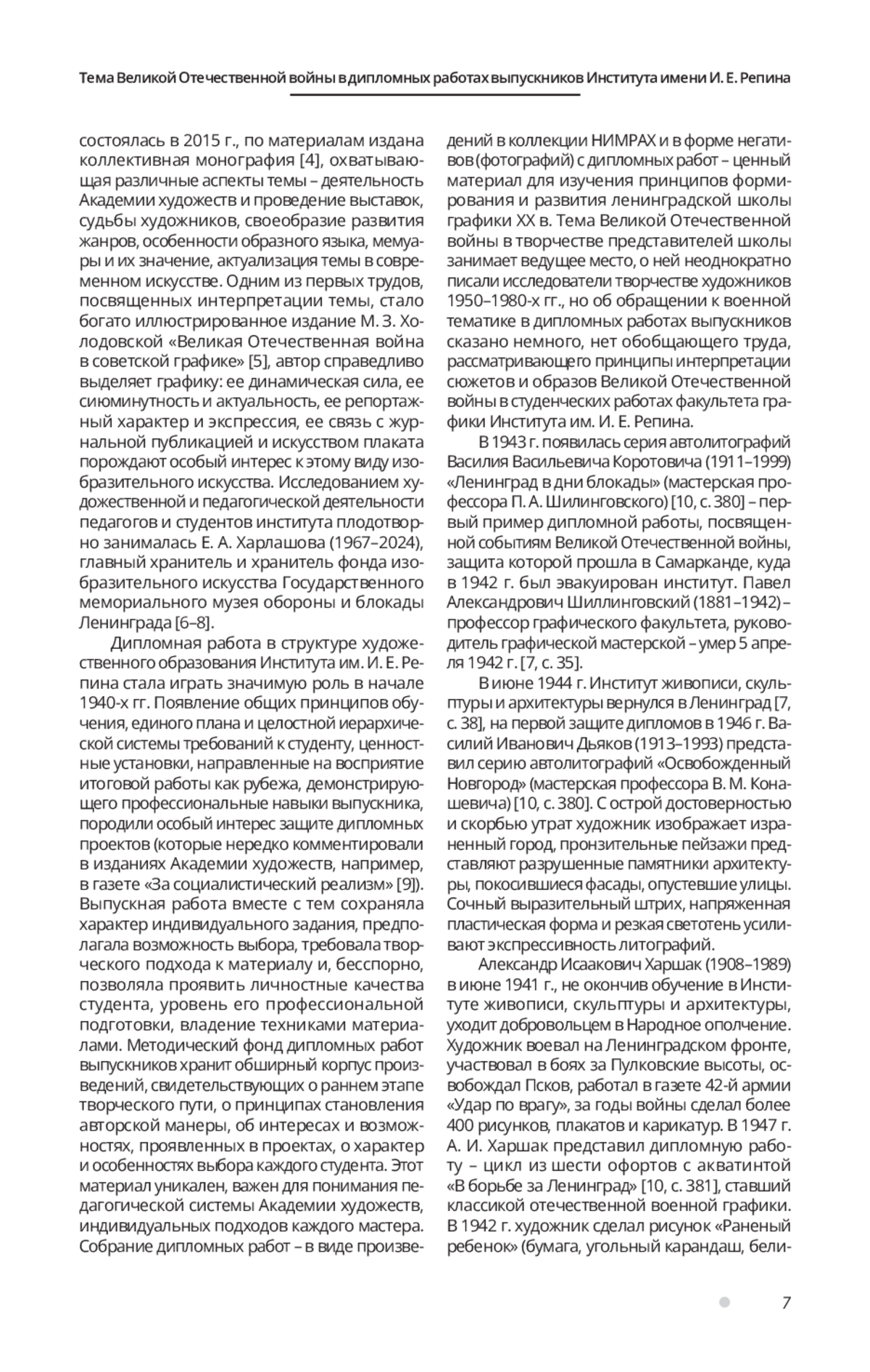 В педагогической практике Института им. И. Е. Репина дипломная работа занимала особое место в обучении художников, созданное по итогам практических занятий произведение должно воплощать понимание принципов визуальной интерпретации темы, композиционной структуры и методов использования средств художественной выразительности. На факультете графики задание могло касаться группы станковых произведений или книжной иллюстрации. С 1943 г. тема Великой Отечественной войны воплощается выпускниками факультета графики ИнЖСА им. И. Е. Репина. Станковые работы повествуют о суровых годах блокады (В. В. Кортович «Ленинград в дни блокады», А. И. Харшак «Героическая оборона Ленинграда», З. И. Барковская «Это было в Ленинграде»), о военном времени (В. М. Звонцов «По дорогам войны», В. Г. Старов «Серия эстампов. 1941–1945»). С 1947 г. художники обращаются к книжной графике на основе сочинений о войне – поэзии Александра Твардовского, прозе Эммануила Казакевича (В. Б. Скворцова, В. В. Петрова(Шульц), В. П. Сидорова, К. В. Владимиров, В. Р. Ипполитов, В. К. Осечкин, Ф. Ф. Махонин, Ю. Н. Лаврухин). Творческое осмысление личных переживаний, формирование корпуса принципов изображения определенного типа сцен, выработка приемов, отражающих реалии эпохи, доминирование нарративного начала, эффекты документальной фиксации явлений и влияние эстетических принципов фотои кинодокументалистики проявляются в дипломных работах художников-графиков первого послевоенного десятилетия.
