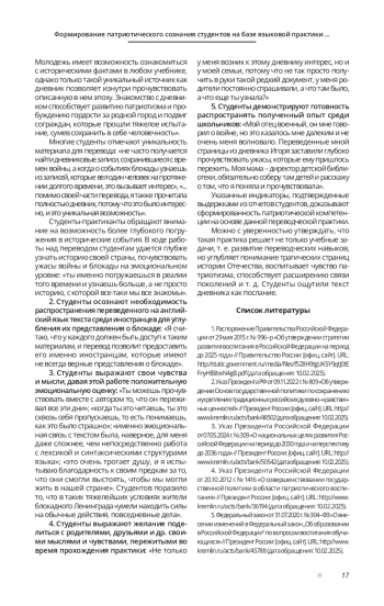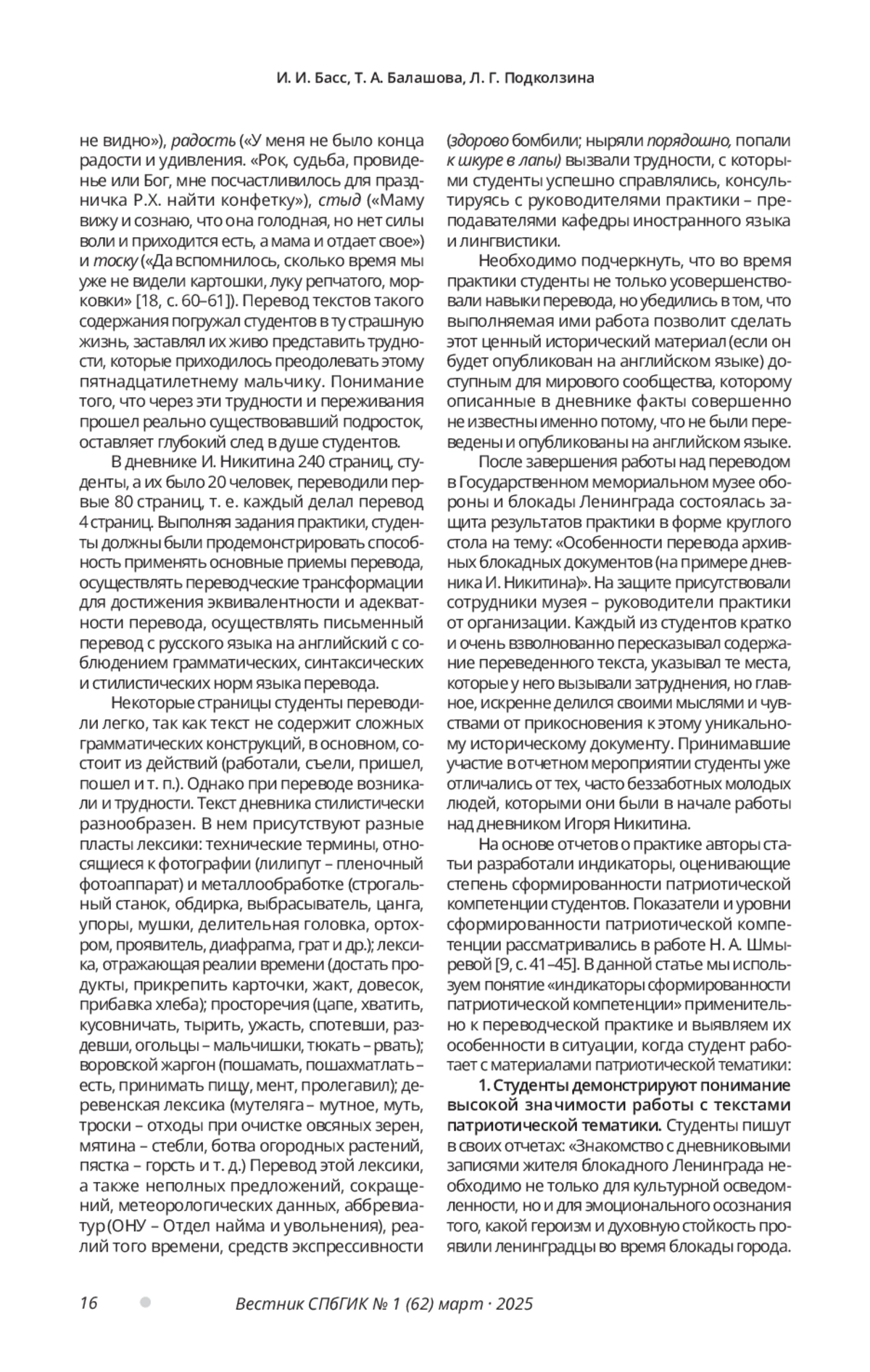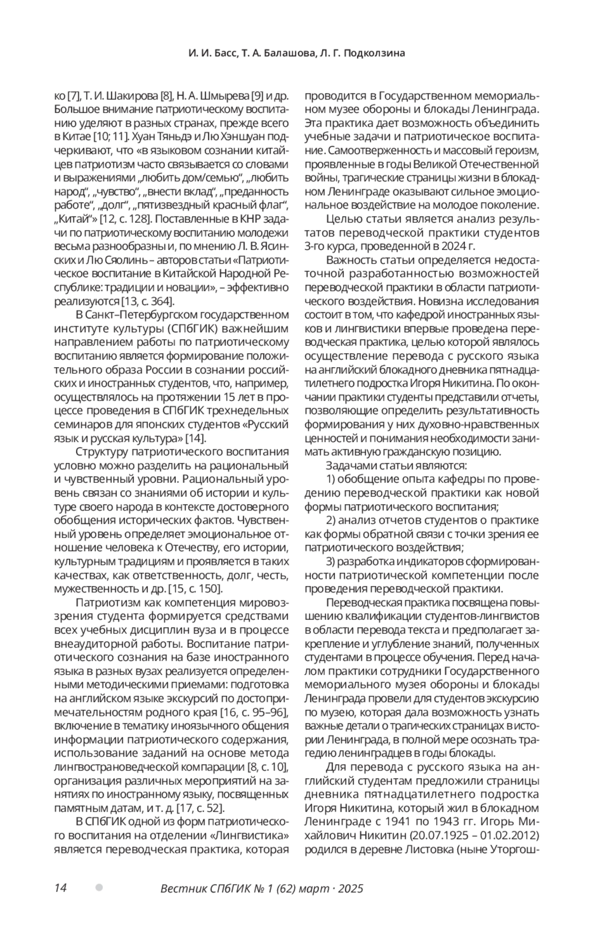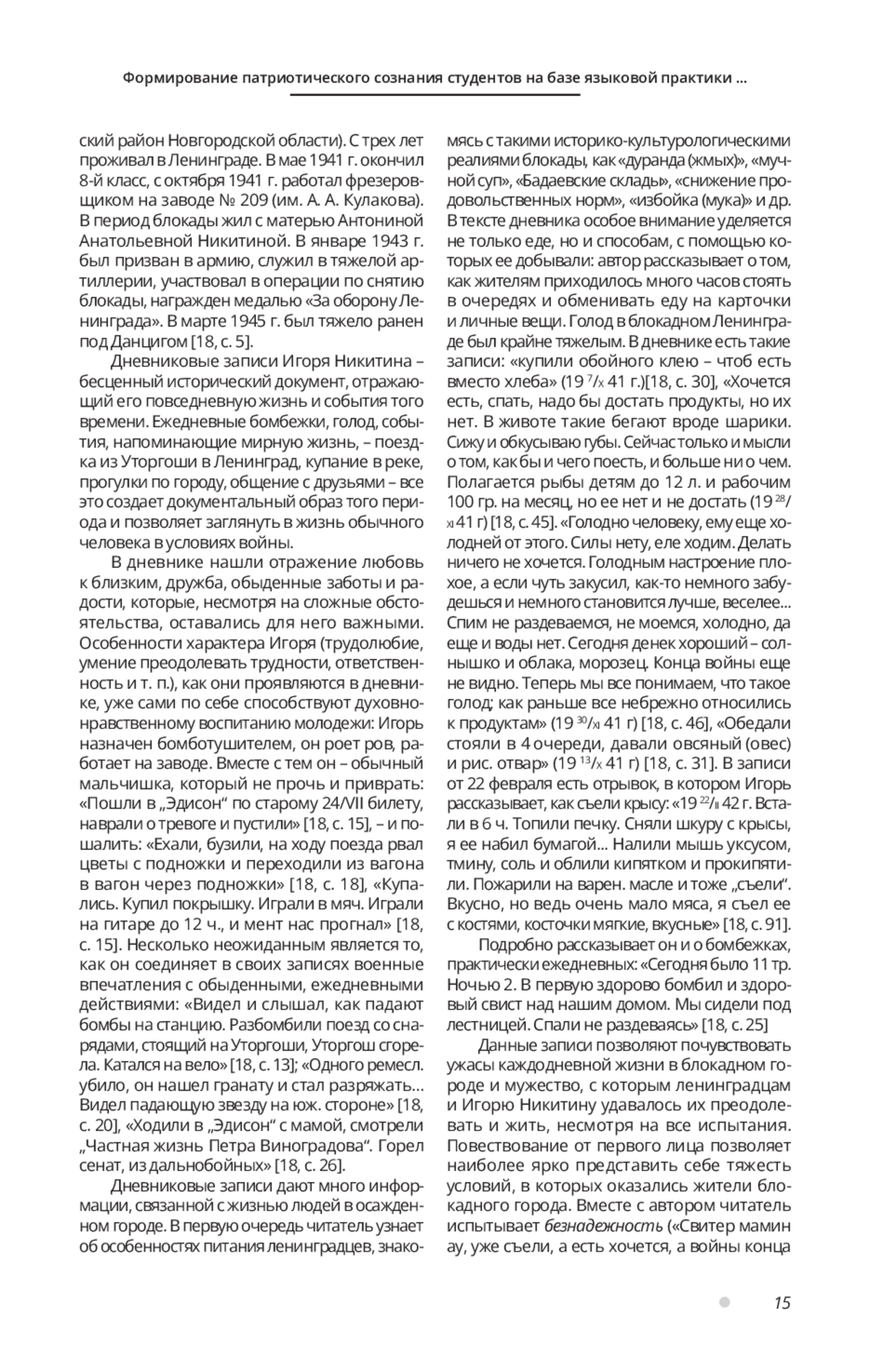 Статья посвящена актуальной проблеме патриотического воспитания студентов вуза культуры. Основное внимание уделено анализу результатов переводческой практики студентов Санкт-Петербургского государственного института культуры направления подготовки «Лингвистика». Практика проходила на базе Государственного мемориального музея обороны и блокады Ленинграда. Студентам предлагалось перевести с русского языка на английский фрагменты блокадного дневника пятнадцатилетнего подростка Игоря Никитина. Решая переводческие задачи и преодолевая переводческие трудности, студенты смогли прикоснуться к духовному подвигу народа, зафиксированному в этом документе, что нашло отражение в виде обратной связи в их отчетах о практике и выступлениях на круглом столе после ее окончания. Студенты делали особый акцент на том, что перевод дневника углубил их понимание трагических страниц в истории страны, помог им осознать трудности, выпавшие на долю молодого поколения того времени, и испытать чувство благодарности за Победу в Великой Отечественной войне. На основе этих отчетов, как вида обратной связи, авторами были разработаны индикаторы патриотической компетенции, позволяющие оценить степень сформированности патриотического сознания студентов. Предлагаемая форма патриотического воспитания должна стать новым и актуальным направлением работы кафедр иностранных языков на лингвистических специальностях в разных вузах России.