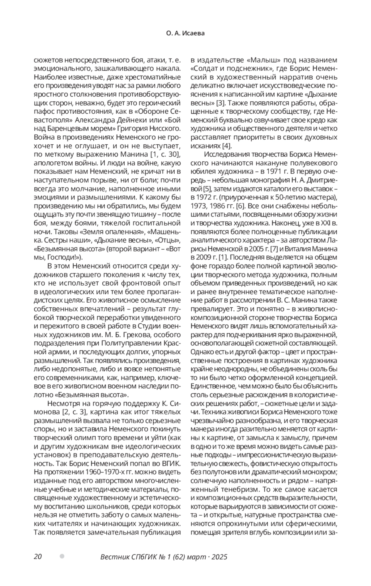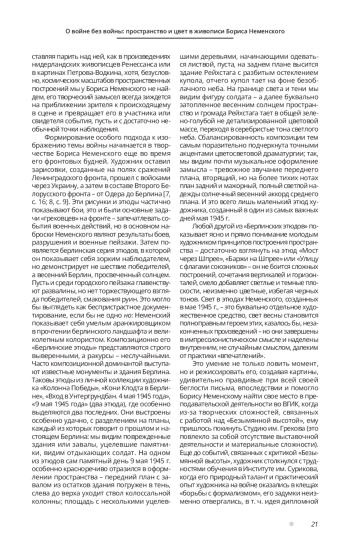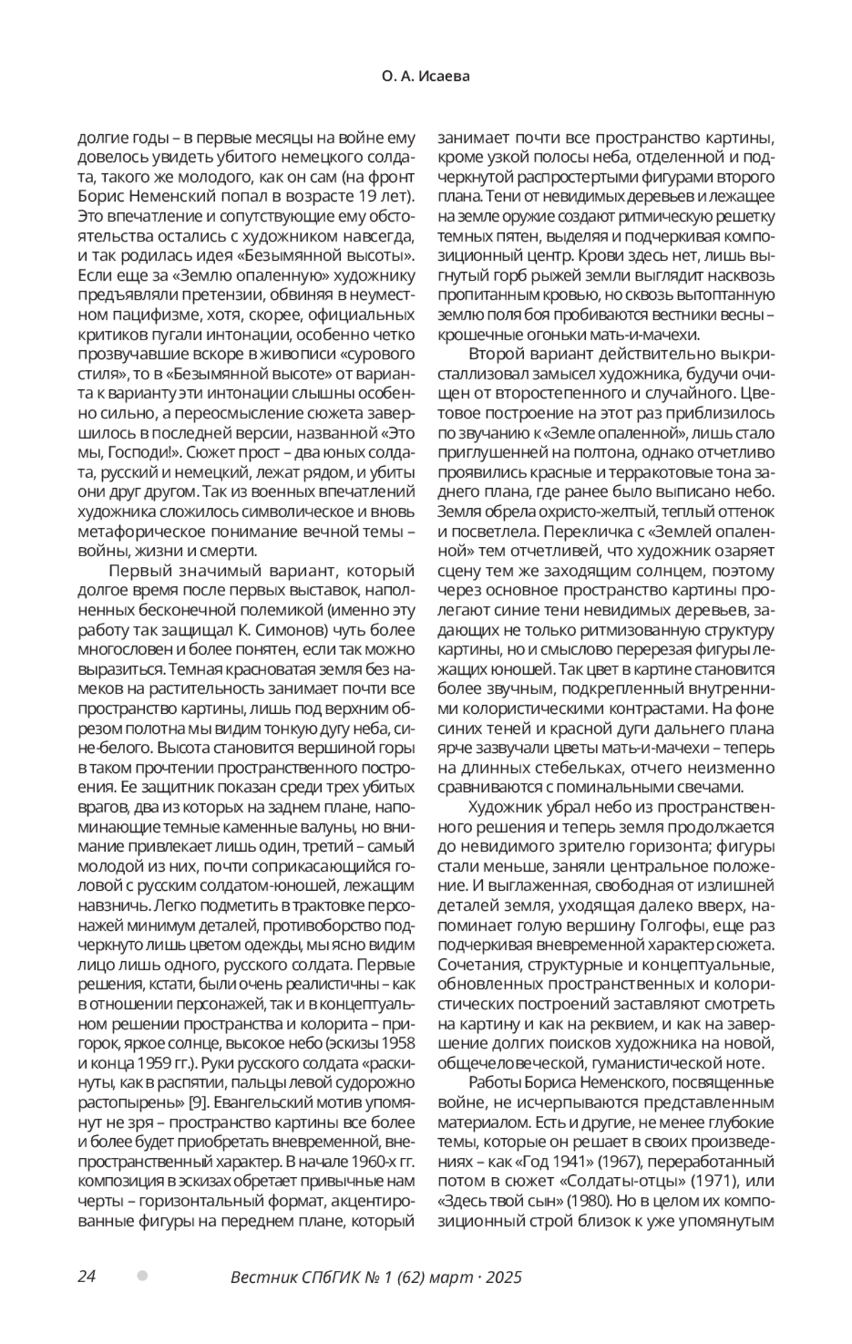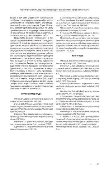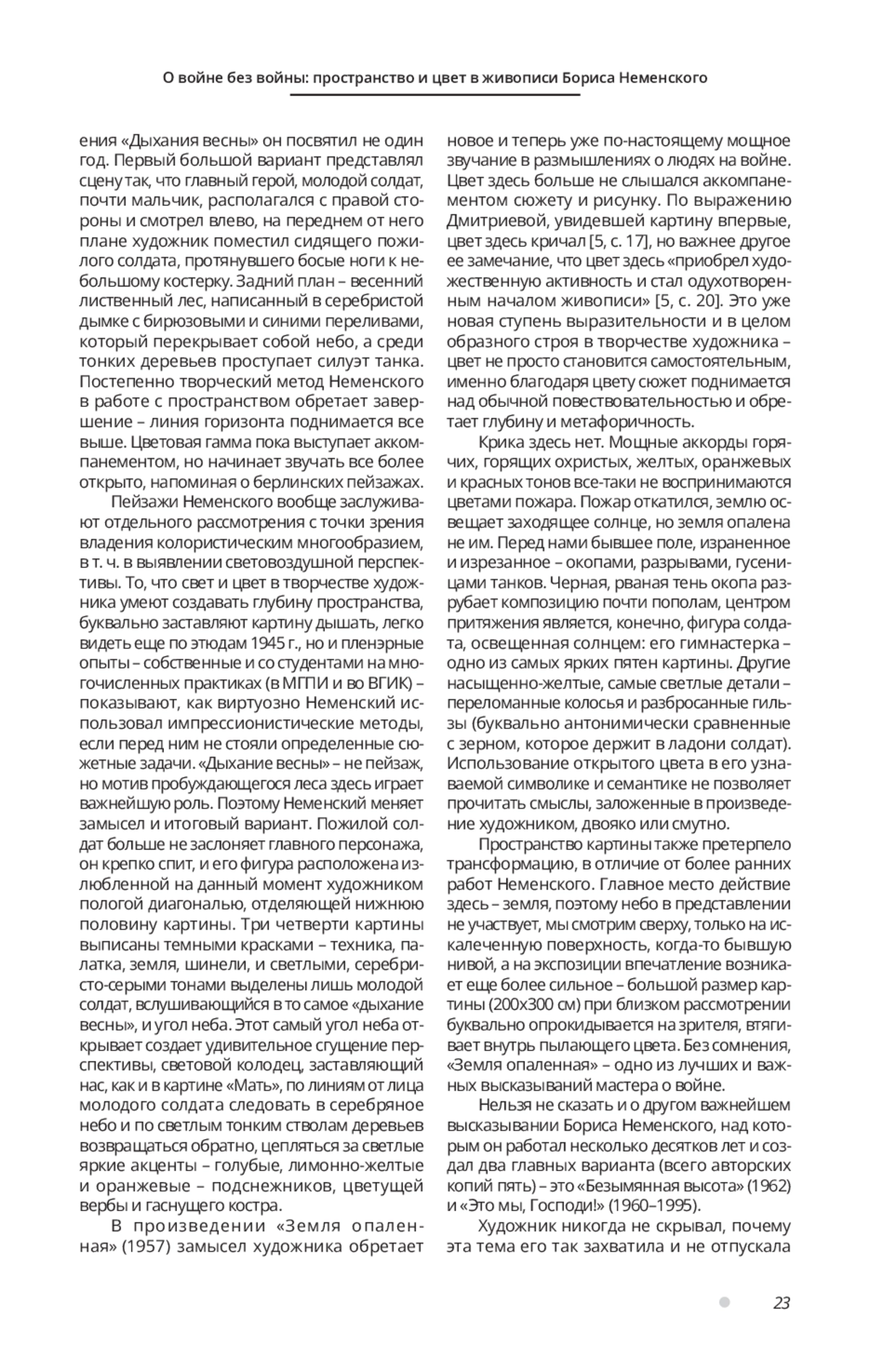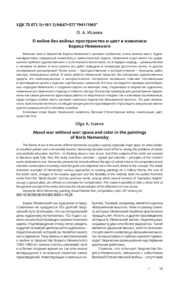 Военная тема в творчестве Бориса Неменского занимает особенное, очень важное место. Художник-фронтовик, прекрасный живописец и замечательный педагог, Неменский отдал много сил разрешению проблем художественного и эстетического воспитания, но в первую очередь – размышлениям о человеке на войне. И если сюжеты его работ освещены в литературе достаточно полно, то данное исследование рассматривает более узкие – пространственные и колористические – принципы работ мастера, посвященных войне. В своих работах Неменский предстает без ригоризма художественных средств, его композиционные и колористические построения неизменно отвечают поставленным в произведении целям и задачам, сцепленным с замыслом. В статье исследуются примеры разнообразных подходов Неменского к созданию картин на военную тему, стержневую в творчестве художника, изменения его творческого подхода и гибкость метода. В качестве примеров для рассмотрения предложены как самые ранние его фронтовые работы из «Берлинских этюдов», так и ключевые послевоенные, среди которых особое место занимает несколько вариантов «Безымянной высоты». Это дает возможность пристальнее взглянуть на общую концепцию его произведений и проследить визуальную эволюцию его размышлений о человеке на войне.