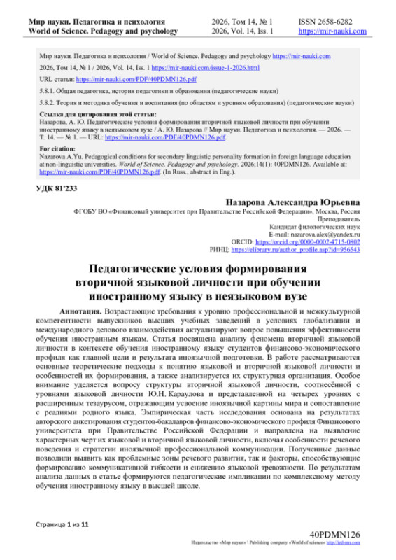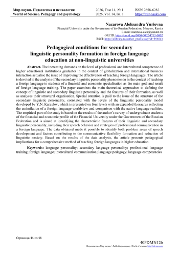 Возрастающие требования к уровню профессиональной и межкультурной компетентности выпускников высших учебных заведений в условиях глобализации и международного делового взаимодействия актуализируют вопрос повышения эффективности обучения иностранным языкам. Статья посвящена анализу феномена вторичной языковой личности в контексте обучения иностранному языку студентов финансово-экономического профиля как главной цели и результата иноязычной подготовки. В работе рассматриваются основные теоретические подходы к понятию языковой и вторичной языковой личности и особенностей их формирования, а также анализируется их структурная организация. Особое внимание уделяется вопросу структуры вторичной языковой личности, соотнесённой с уровнями языковой личности Ю. Н. Караулова и представленной на четырех уровнях с расширенным тезаурусом, отражающим усвоение иноязычной картины мира и сопоставление с реалиями родного языка. Эмпирическая часть исследования основана на результатах авторского анкетирования студентов-бакалавров финансово-экономического профиля Финансового университета при Правительстве Российской Федерации и направлена на выявление характерных черт их языковой и вторичной языковой личности, включая особенности речевого поведения и стратегии иноязычной профессиональной коммуникации. Полученные данные позволили выявить как проблемные зоны речевого развития, так и факторы, способствующие формированию коммуникативной гибкости и снижению языковой тревожности. По результатам анализа данных в статье формируются педагогические импликации по комплексному методу обучения иностранному языку в высшей школе.