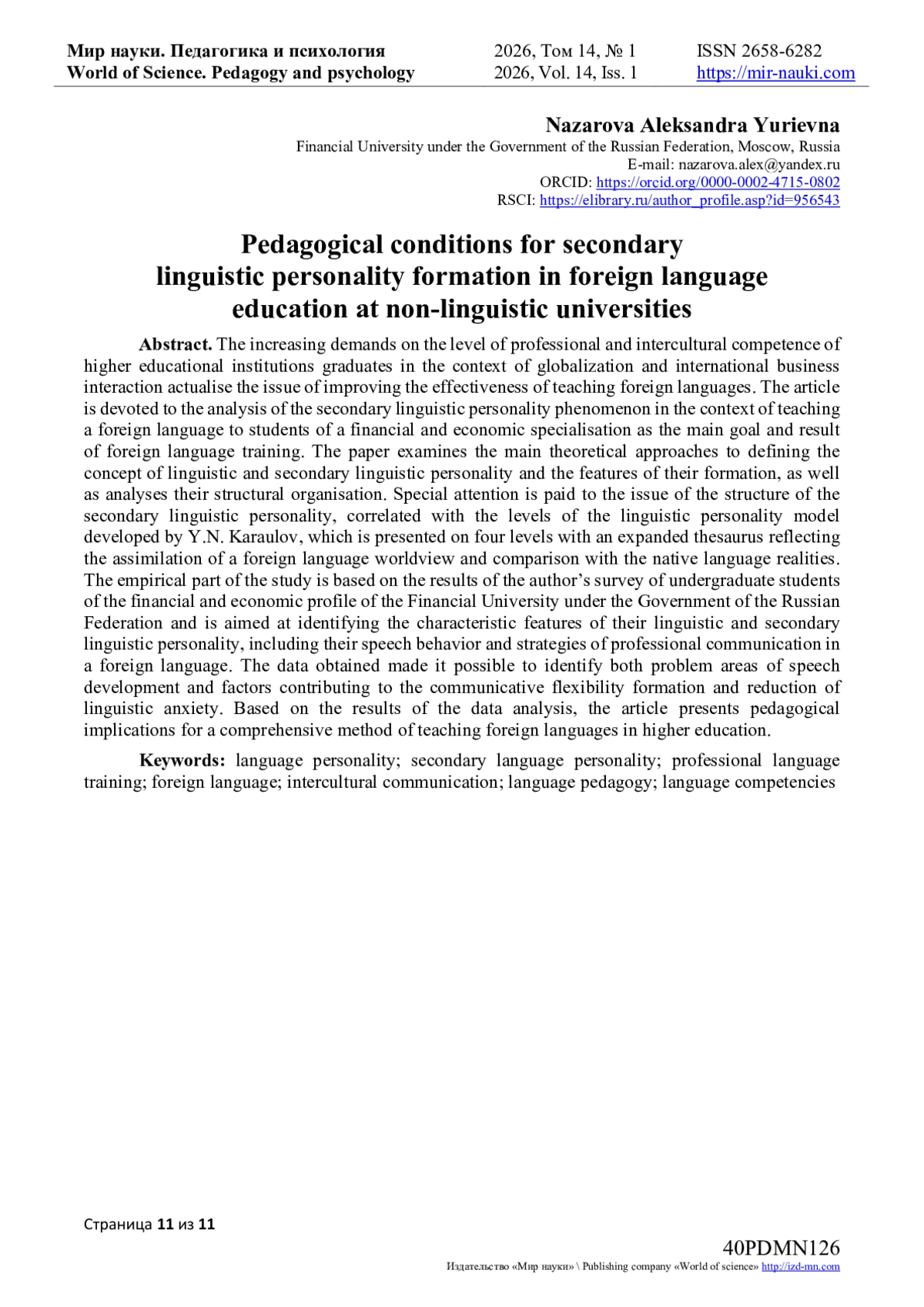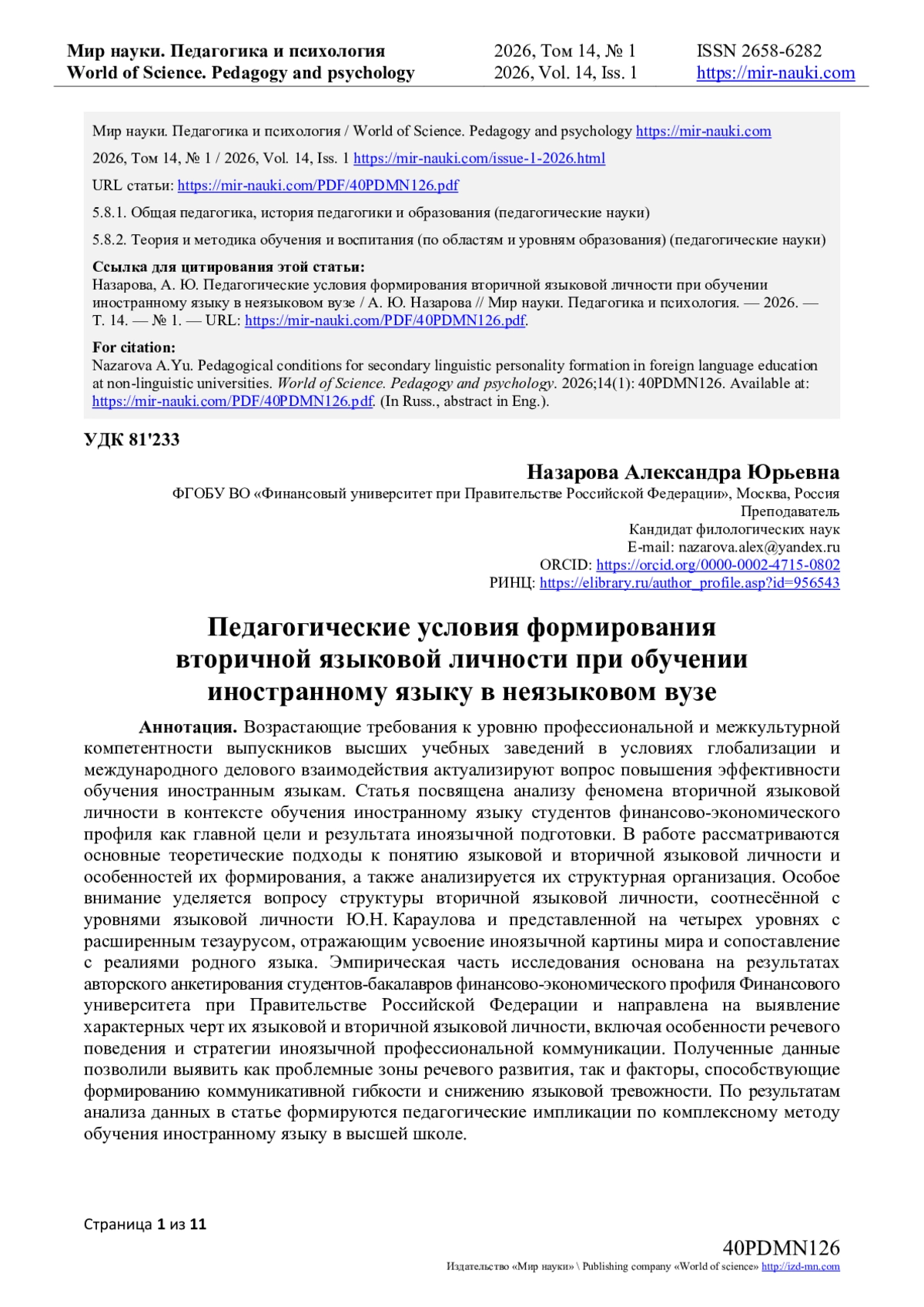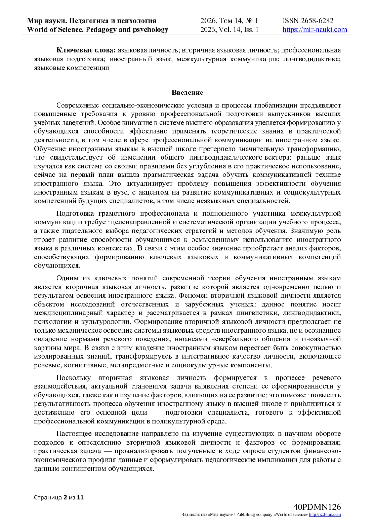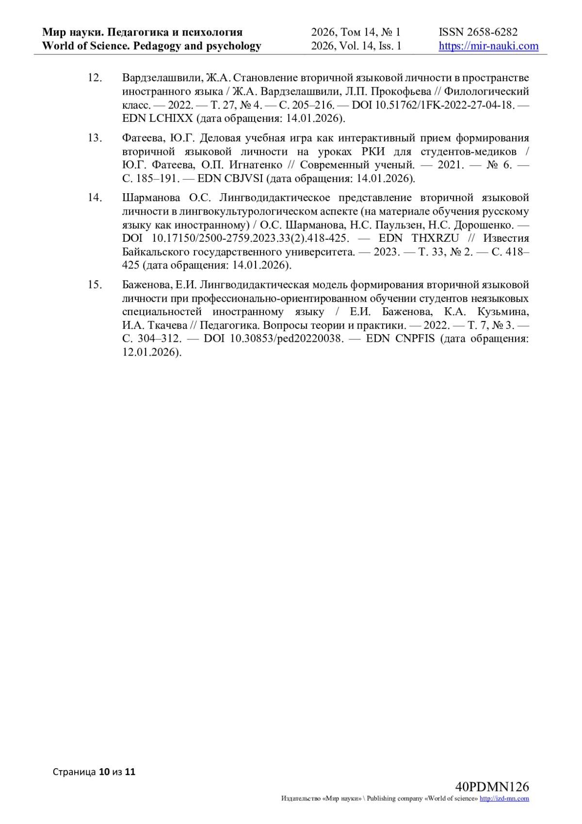 7. Боярко, С.А. Психолингвистический подход к формированию качеств вторичной языковой личности будущих экономистов / С.А. Боярко // Мир науки. Педагогика и психология. — 2024. — Т. 12. — № 5. — URL: https://mirnauki.com/PDF/70PDMN524.pdf (дата обращения: 14.01.2026).