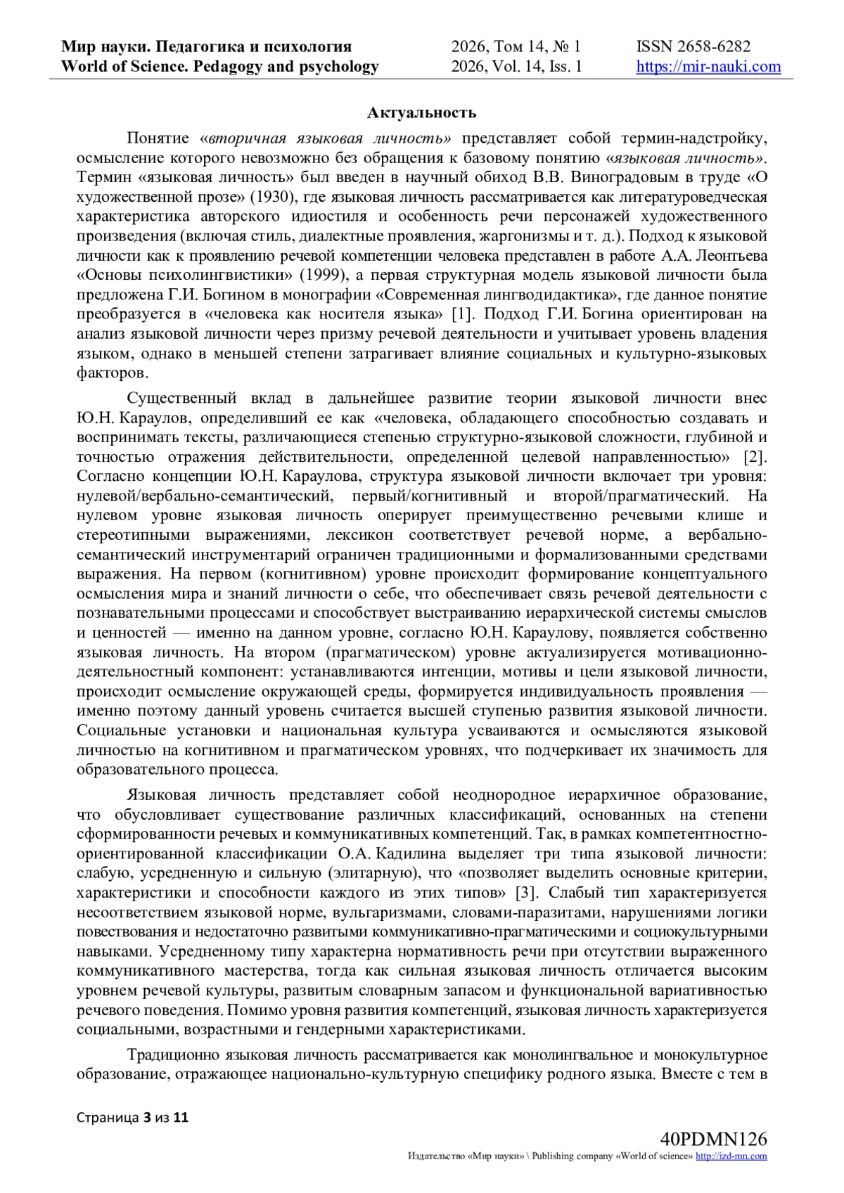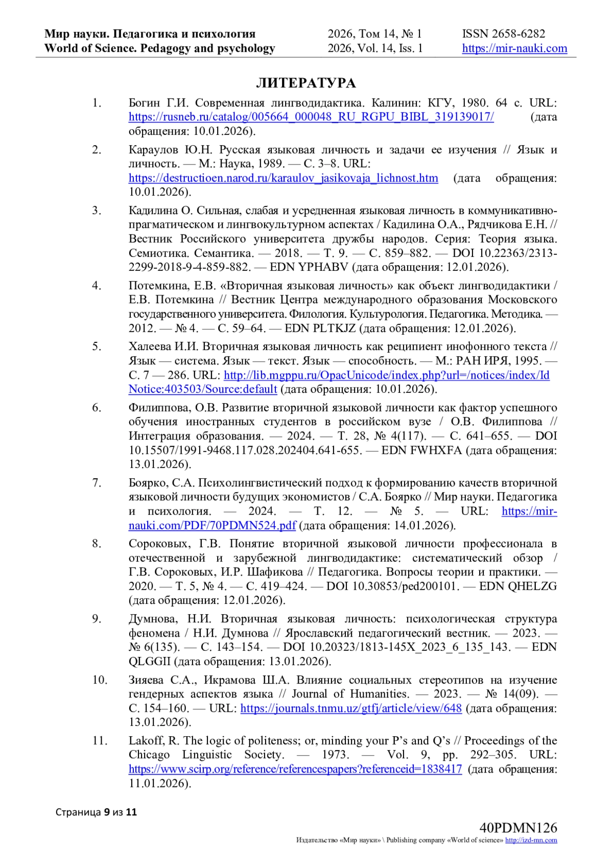 9. Думнова, Н.И. Вторичная языковая личность: психологическая структура феномена / Н.И. Думнова // Ярославский педагогический вестник. — 2023. — № 6(135). — С. 143–154. — DOI 10.20323/1813-145X_2023_6_135_143. — EDN QLGGII (дата обращения: 13.01.2026).