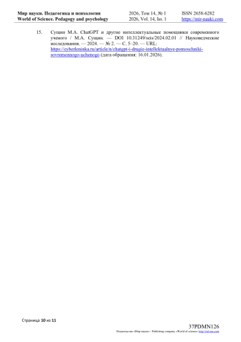 15. Сущин М.А. ChatGPT и другие интеллектуальные помощники современного ученого / М.А. Сущин. — DOI 10.31249/scis/2024.02.01 // Науковедческие исследования. — 2024. — № 2. — С. 5–20. — URL: