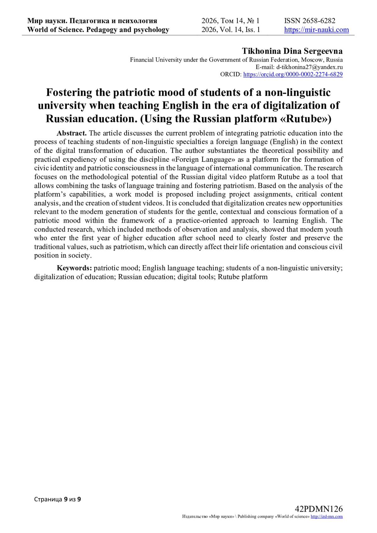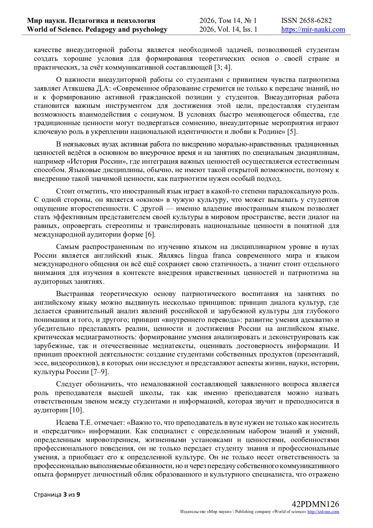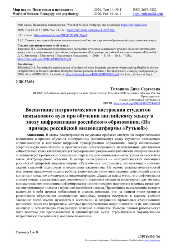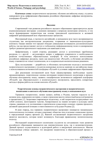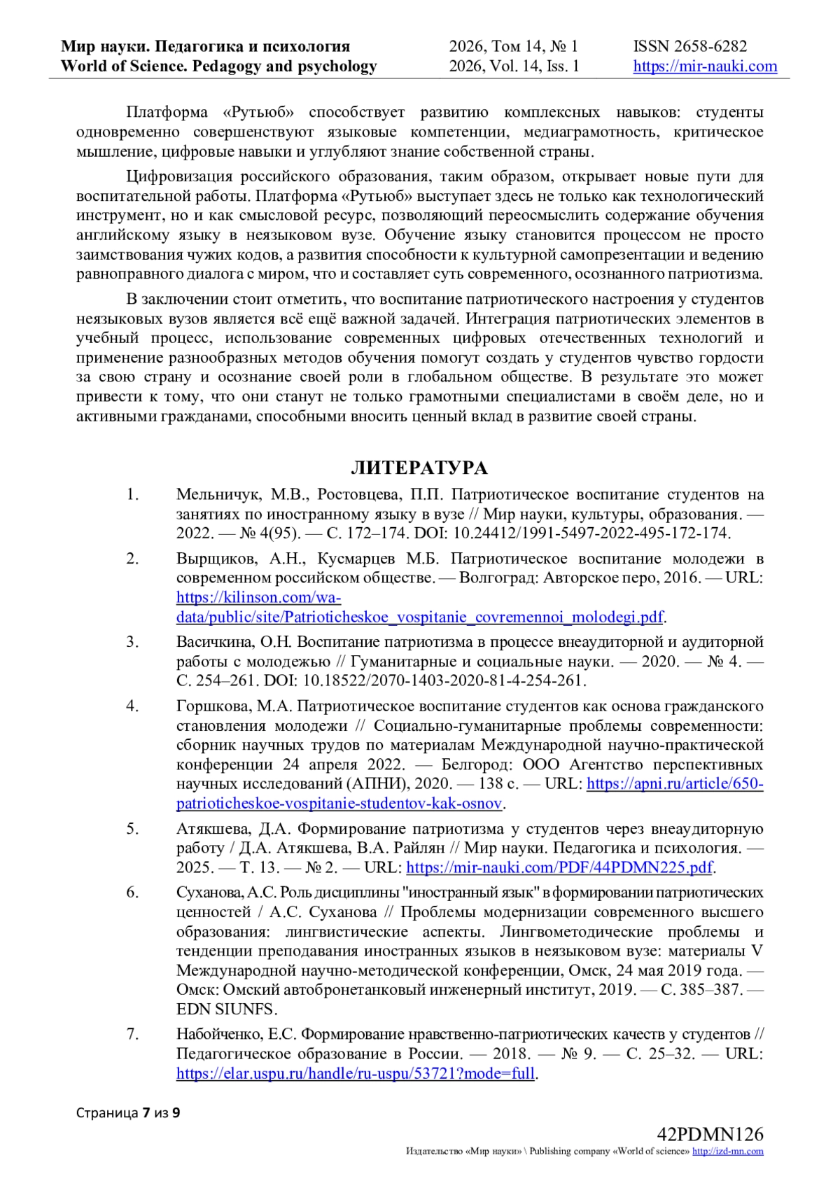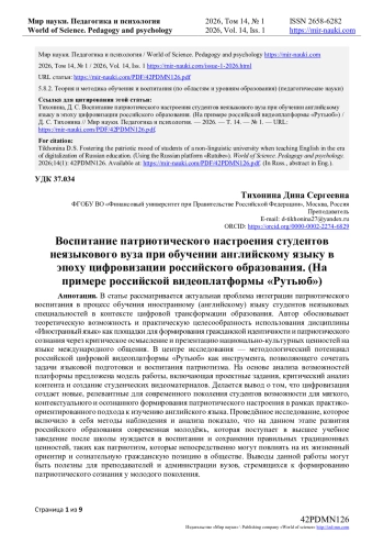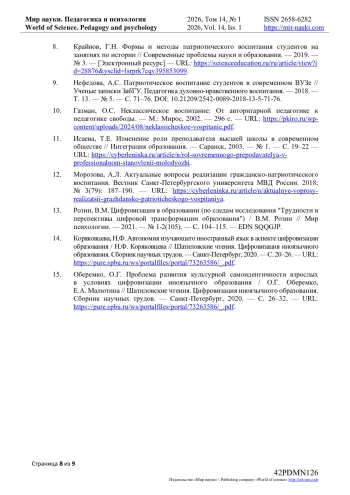 5. Атякшева, Д.А. Формирование патриотизма у студентов через внеаудиторную работу / Д.А. Атякшева, В.А. Райлян // Мир науки. Педагогика и психология. — 2025. — Т. 13. — № 2. — URL: https://mir-nauki.com/PDF/44PDMN225.pdf.