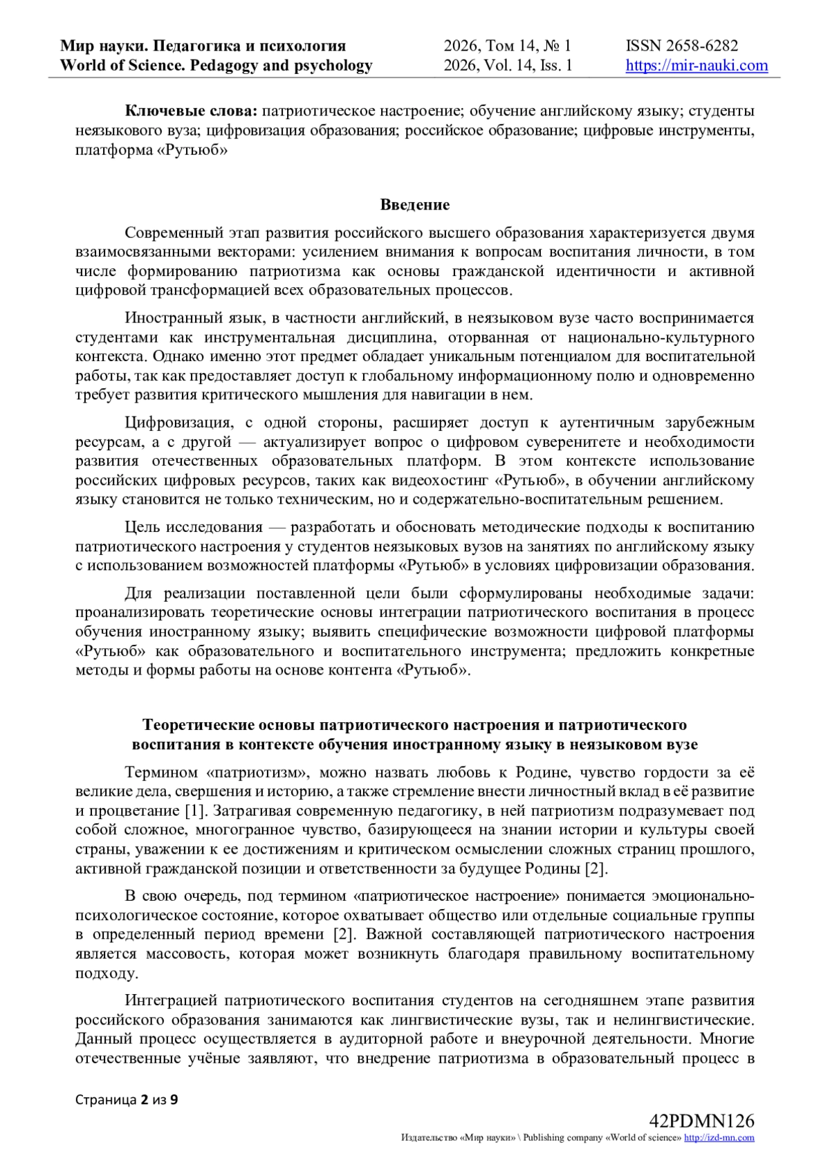 1. Мельничук, М.В., Ростовцева, П.П. Патриотическое воспитание студентов на занятиях по иностранному языку в вузе // Мир науки, культуры, образования. — 2022. — № 4(95). — С. 172–174. DOI: 10.24412/1991-5497-2022-495-172-174.