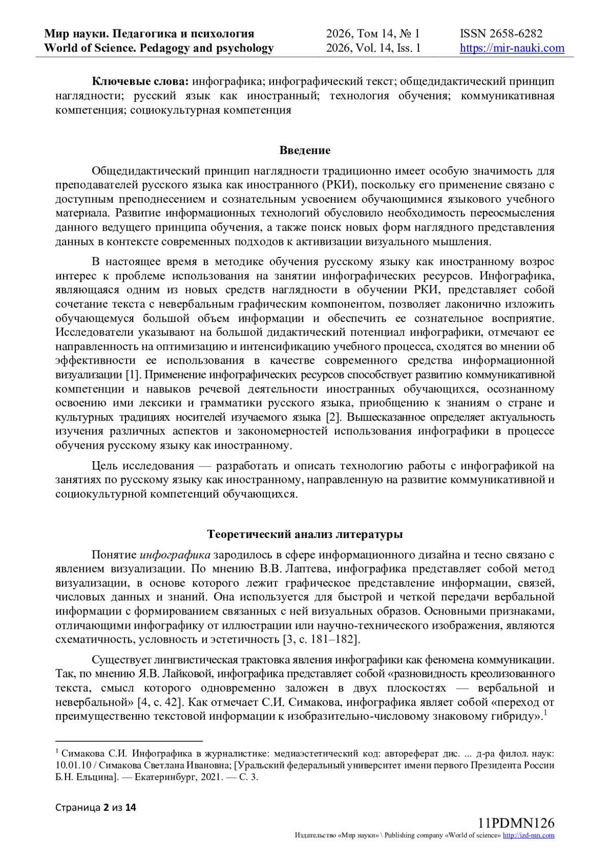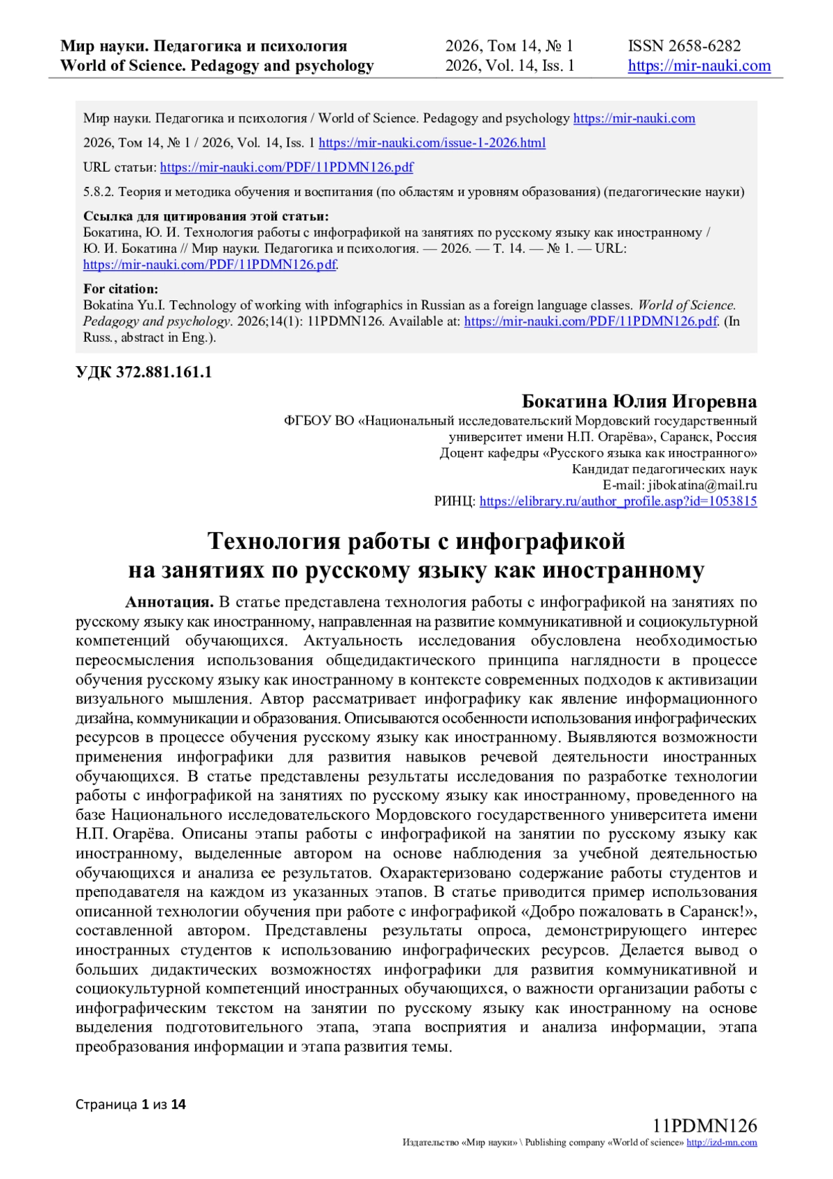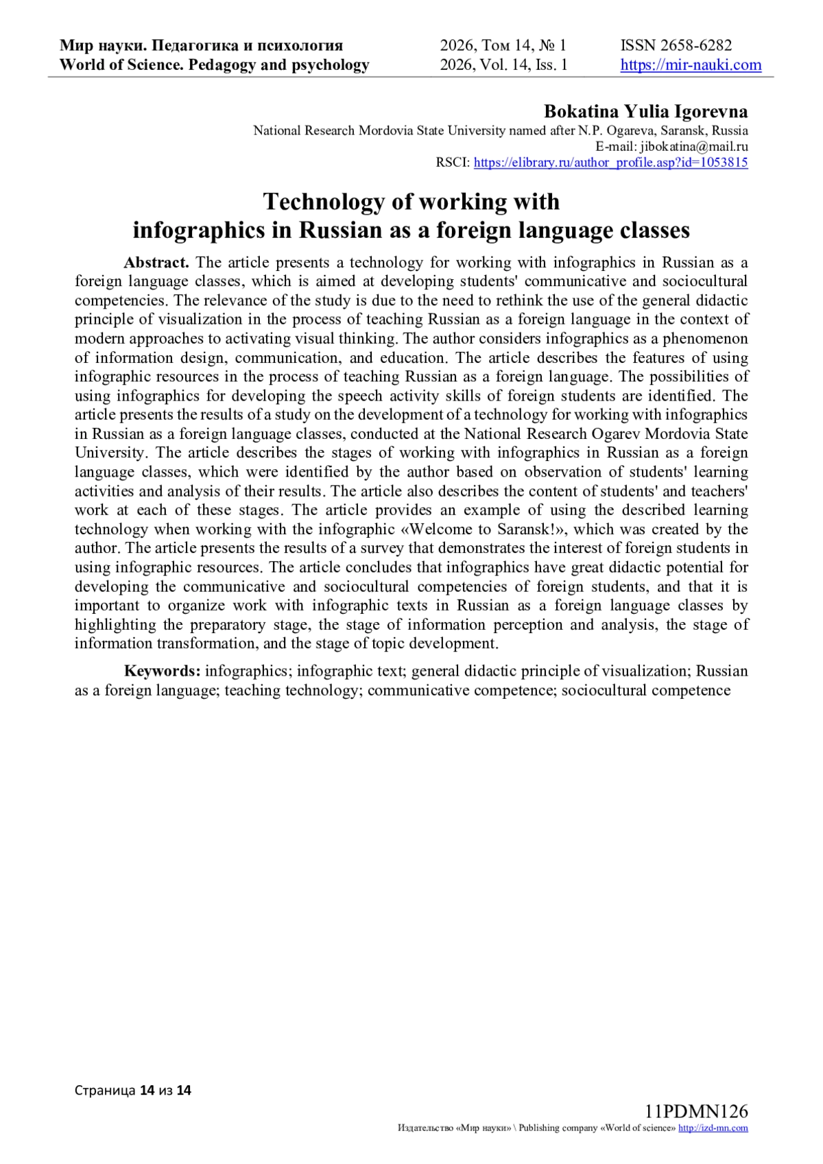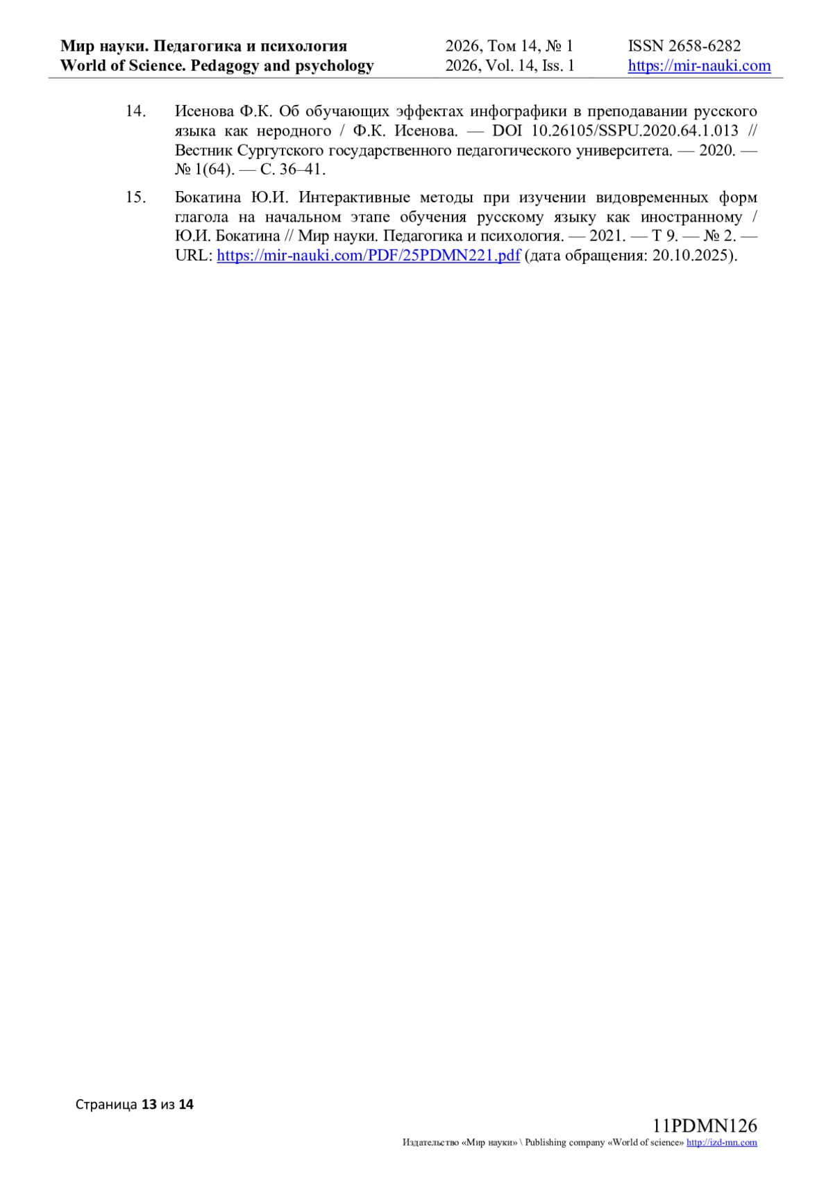 14. Исенова Ф.К. Об обучающих эффектах инфографики в преподавании русского языка как неродного / Ф.К. Исенова. — DOI 10.26105/SSPU.2020.64.1.013 // Вестник Сургутского государственного педагогического университета. — 2020. —