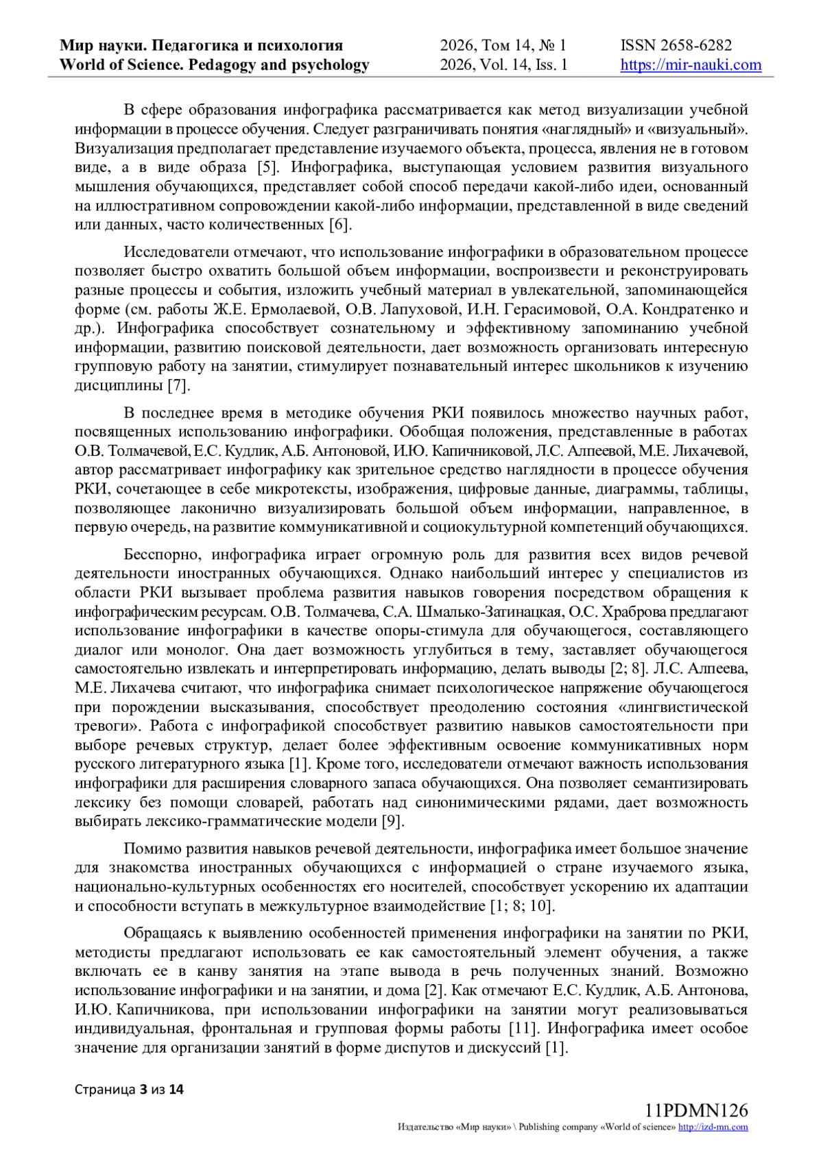 10. Пылкова А.А. Лингводидактический потенциал инфографических текстов в преподавании русского языка как иностранного в условиях дистанционного обучения / А.А. Пылкова. — DOI 10.30853/phil20210632 // Филологические науки. Вопросы теории и практики. — 2021. — Т 14, № 12. — 4064–4068.