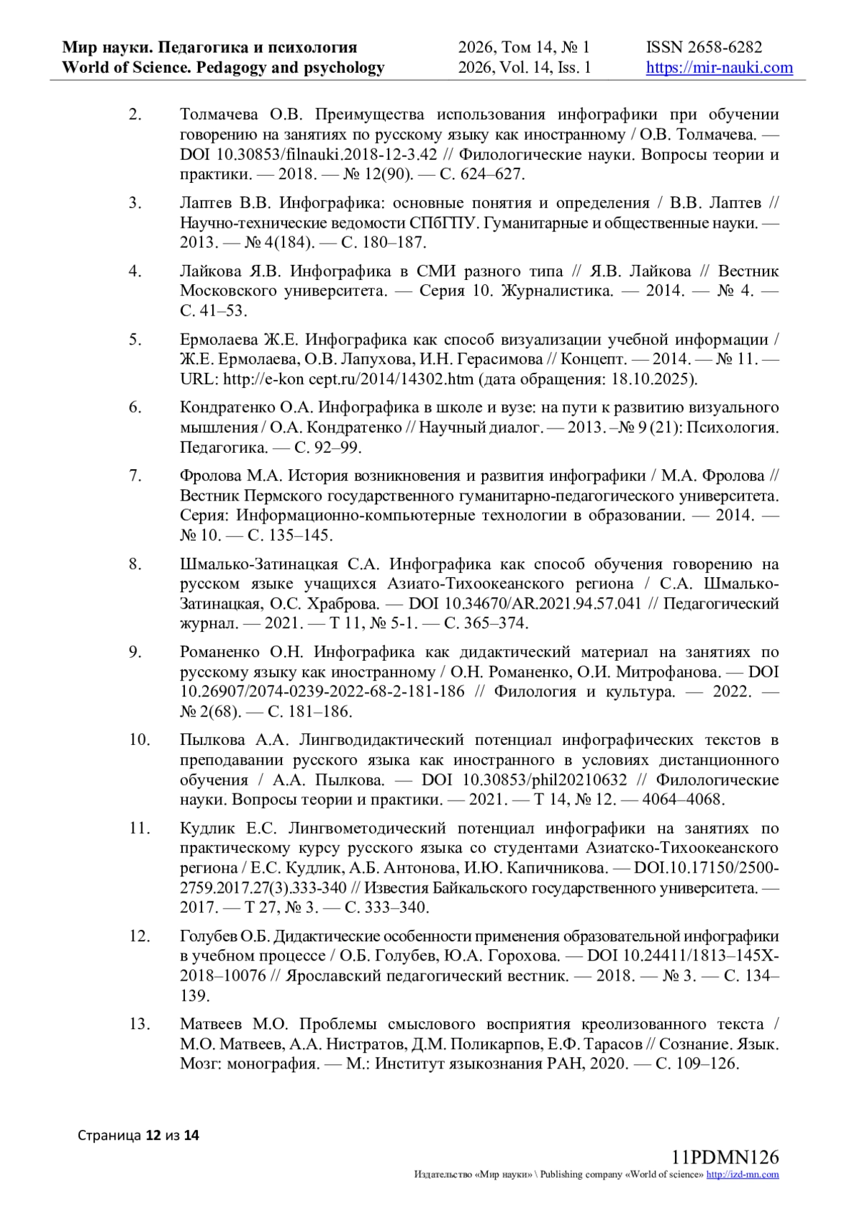 9. Романенко О.Н. Инфографика как дидактический материал на занятиях по русскому языку как иностранному / О.Н. Романенко, О.И. Митрофанова. — DOI 10.26907/2074-0239-2022-68-2-181-186 // Филология и культура. — 2022. — № 2(68). — С. 181–186.