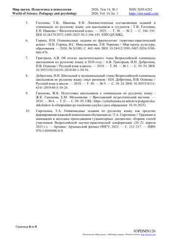 5. Гоголина, Т.В., Иванова, Е.Н. Лингвистическая составляющая заданий в олимпиадах по русскому языку для школьников и студентов / Т.В. Гоголина, Е.Н. Иванова // Филологический класс. — 2025. — Т. 30. — № 2. — С. 186–193. DOI 10.26170/2071-2405-2025-30-2-186-193. EDN QJUMKL.