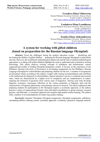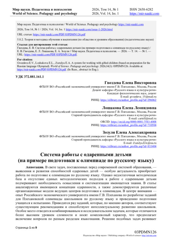 В свете задач, поставленных перед современной системой образования, — выявления и развития способностей одаренных детей — особую актуальность приобретает работа по подготовке к олимпиадам по русскому языку. Однако недостаточная методическая база и отсутствие единых методологических подходов к работе с одаренными детьми подчеркивают необходимость осмысления и систематизации имеющегося знания. В статье анализируются имеющиеся концепции одаренности, а также демонстрируются различные организационные модели ведущих центров подготовки к олимпиадам. В центре внимания — опыт Российского экономического университета имени Г. В. Плеханова по разработке заданий для Плехановской олимпиады школьников по русскому языку и проведению подготовки учащихся к испытанию. Приводится ряд заданий, которые, по мнению авторов, соответствуют существующим рекомендациям и способствуют интеллектуальному развитию школьников. Особое место отводится комбинированным и исследовательским задачам, которые отличаются более высоким уровнем сложности и носят комплексный характер, что предполагает включение вопросов по разным разделам языкознания. Решение подобных задач развивает языковое чутье, побуждает к размышлению над различными свойствами языковых единиц и особенностями языковых явлений, поддерживает интерес к исследовательской деятельности. В статье подчеркивается, что подготовка школьника к участию в олимпиаде требует системного подхода, поэтому авторами представлены разнообразные организационные формы от индивидуальных консультаций до групповых семинаров, исследовательских проектов и выездных школ. Системный подход предполагает и качественную подготовку учителей. Авторы предлагают ряд рекомендаций по совершенствованию подготовки педагогов.