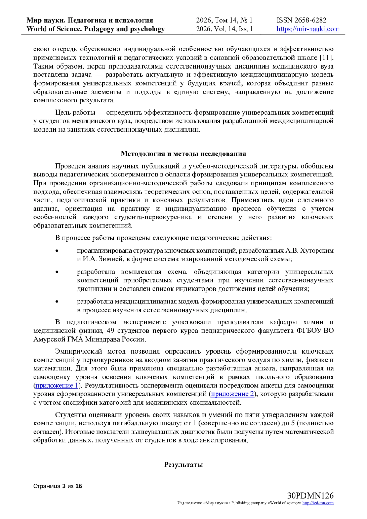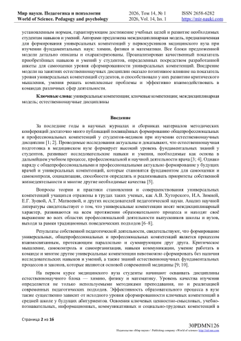 1. Россомахина, О.М. Модель практико-ориентированной естественнонаучной подготовки будущих специалистов в сфере клинической медицины / О.М. Россомахина // Мир науки. Педагогика и психология. — 2022. — Т. 10. — № 6. — URL: https://mir-nauki.com/PDF/35PDMN622.pdf.