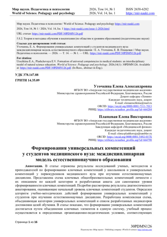 4. Уточкина, Е.А. Методологические аспекты формирования исследовательских умений у будущих врачей в процессе изучения химии в медицинском вузе / Е.А. Уточкина // Мир науки. Педагогика и психология. — 2023. — Т 11. — № 4.