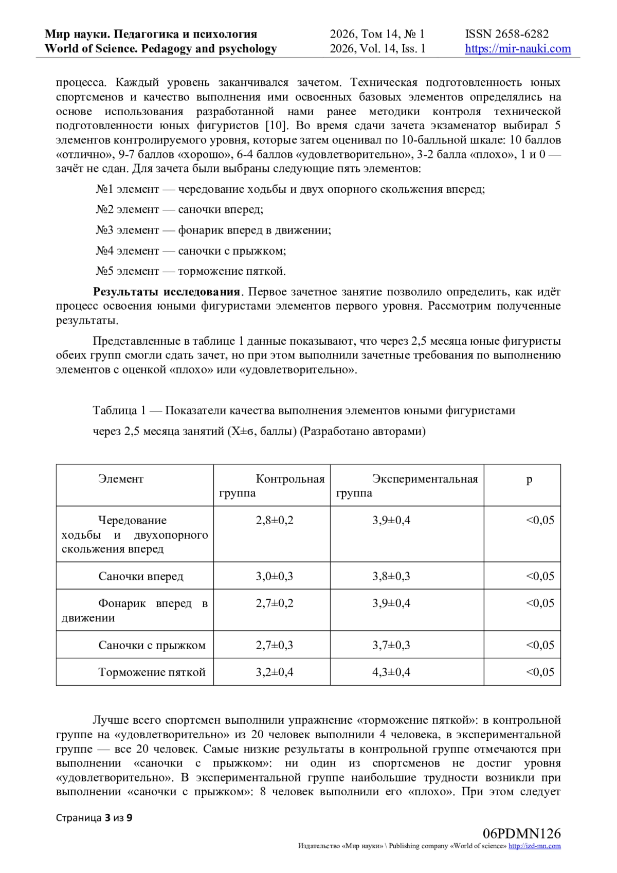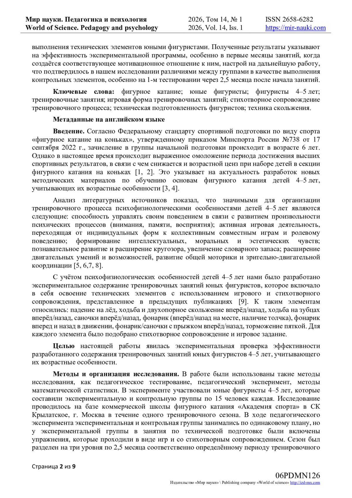 Целью настоящей работы явилась экспериментальная проверка эффективности разработанного содержания тренировочных занятий юных фигуристов 4–5 лет. В эксперименте участвовали юные фигуристы 4–5 лет, которые составили экспериментальную и контрольную группы по 15 человек каждая. В экспериментальной группе в занятия по технической подготовке были включены упражнения, которые проходили в виде игр и со стихотворным сопровождением. Через каждые 2,5 месяца проводилось зачетное занятие, в ходе которого оценивалось качество выполнения технических элементов юными фигуристами. Полученные результаты указывают на эффективность экспериментальной программы, особенно в первые месяцы занятий, когда создаётся соответствующее мотивационное отношение к ним, настрой на дальнейшую работу, что подтвердилось в нашем исследовании различиями между группами в качестве выполнения контрольных элементов, особенно на 1-м тестировании через 2,5 месяца после начала занятий.
