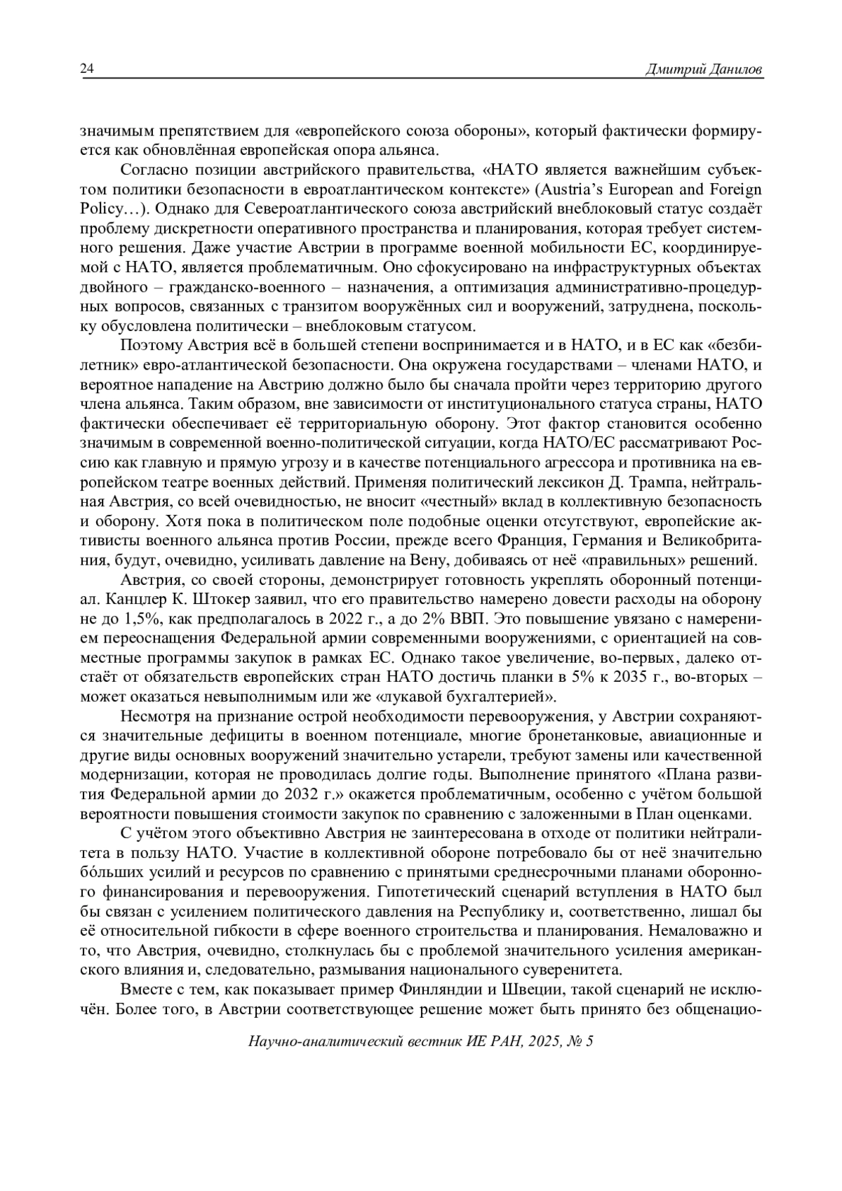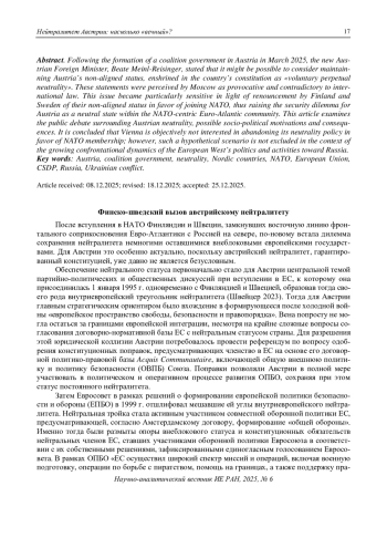 14. Швейцер, В.Я. (2023). Австрийский нейтралитет в контексте кризиса европейской безопасности // Европа в глобальной пересборке. Под редакцией Ал.А. Громыко. М.: ИЕ РАН. С. 450-461.