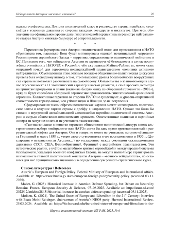 6. Афанасьева, К.В. (2025). Австрии заявили, что не собираются вступать в НАТО. РИА Новости. 01.09.2025.