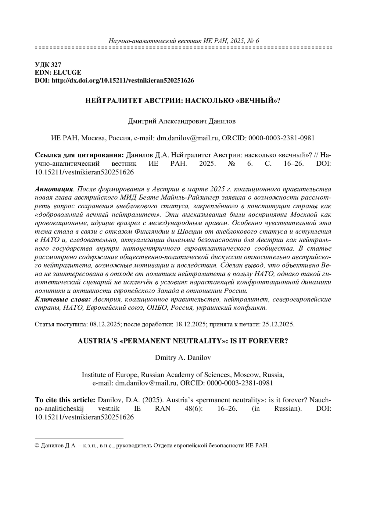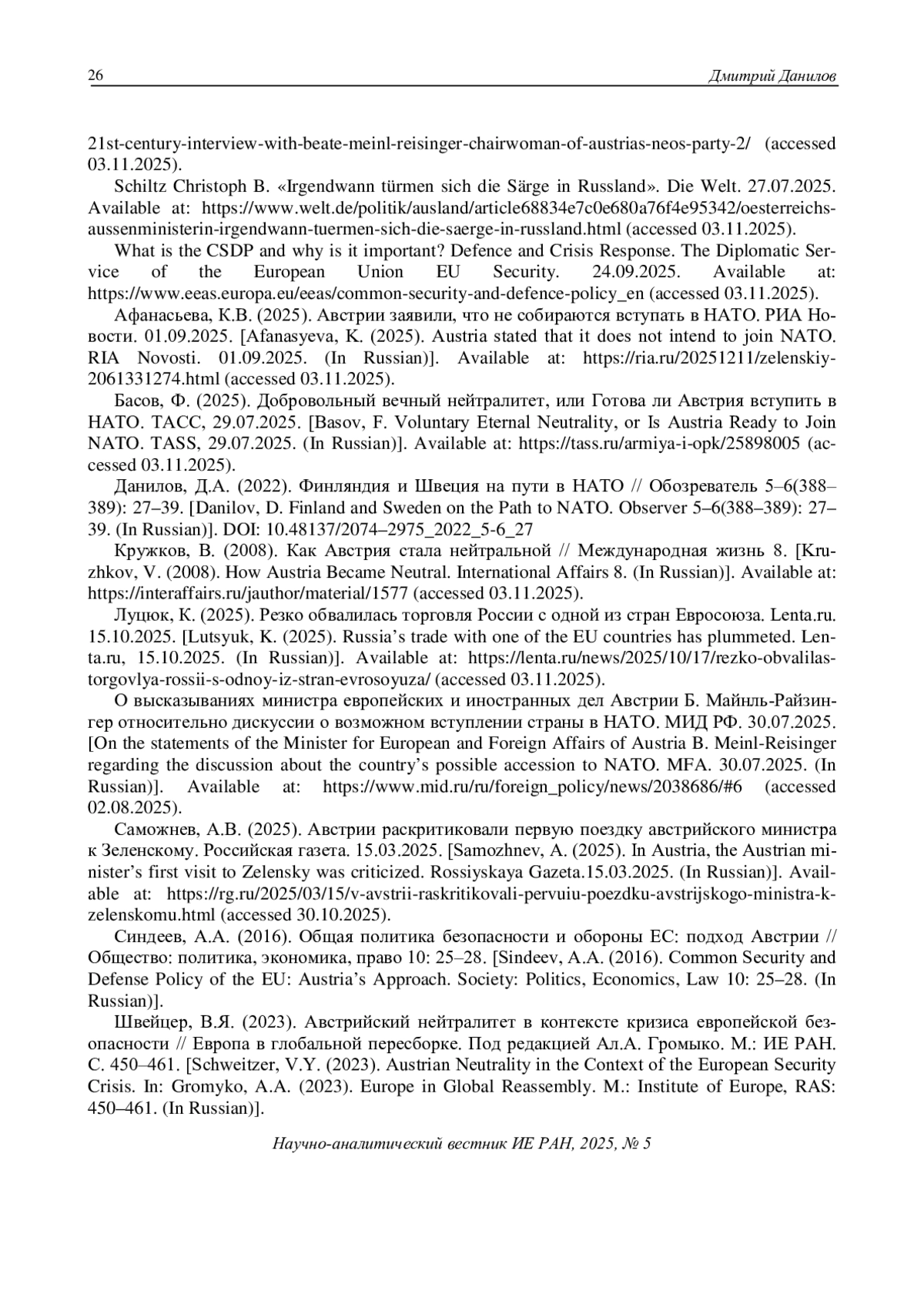 Afanasyeva, K. (2025). Austria stated that it does not intend to join NATO. RIA Novosti. 01.09.2025. (In Russian). Available at: https://ria.ru/20251211/zelenskiy-2061331274.html (accessed 03.11.2025).