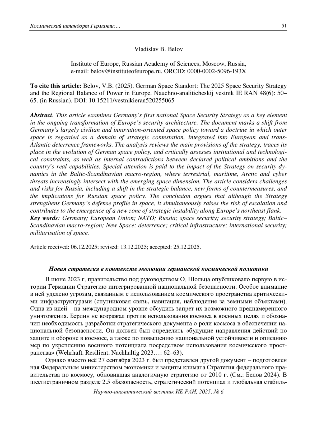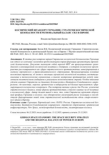 В статье рассмотрена первая Стратегия космической безопасности Германии как одного из ключевых элементов продолжающейся трансформации архитектуры европейской безопасности. Документ знаменует собой переход ФРГ от преимущественно гражданской и инновационной космической политики к доктрине, в которой космическое пространство рассматривается как сфера стратегического противостояния, интегрированная в систему европейского и трансатлантического сдерживания. Проанализированы основные положения стратегии, её место в эволюции германской космической политики, институциональные и технологические ограничения, а также внутренние противоречия между заявленными политическими амбициями и реальными возможностями страны. Особое внимание уделено влиянию Стратегии на динамику безопасности в Балтийско-Скандинавском макрорегионе, где наземные, морские, арктические и киберугрозы всё больше пересекаются с формирующимся космическим измерением. Рассмотрены вызовы и риски для России: изменение стратегического баланса, новые формы противодействия, а также влияние на её политику в космической сфере. Автор делает вывод о том, что, хотя Стратегия укрепляет оборонный профиль Германии в космосе, она одновременно увеличивает риски эскалации и способствует формированию новой зоны стратегической нестабильности вдоль северо-восточного фланга Европы