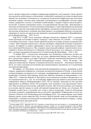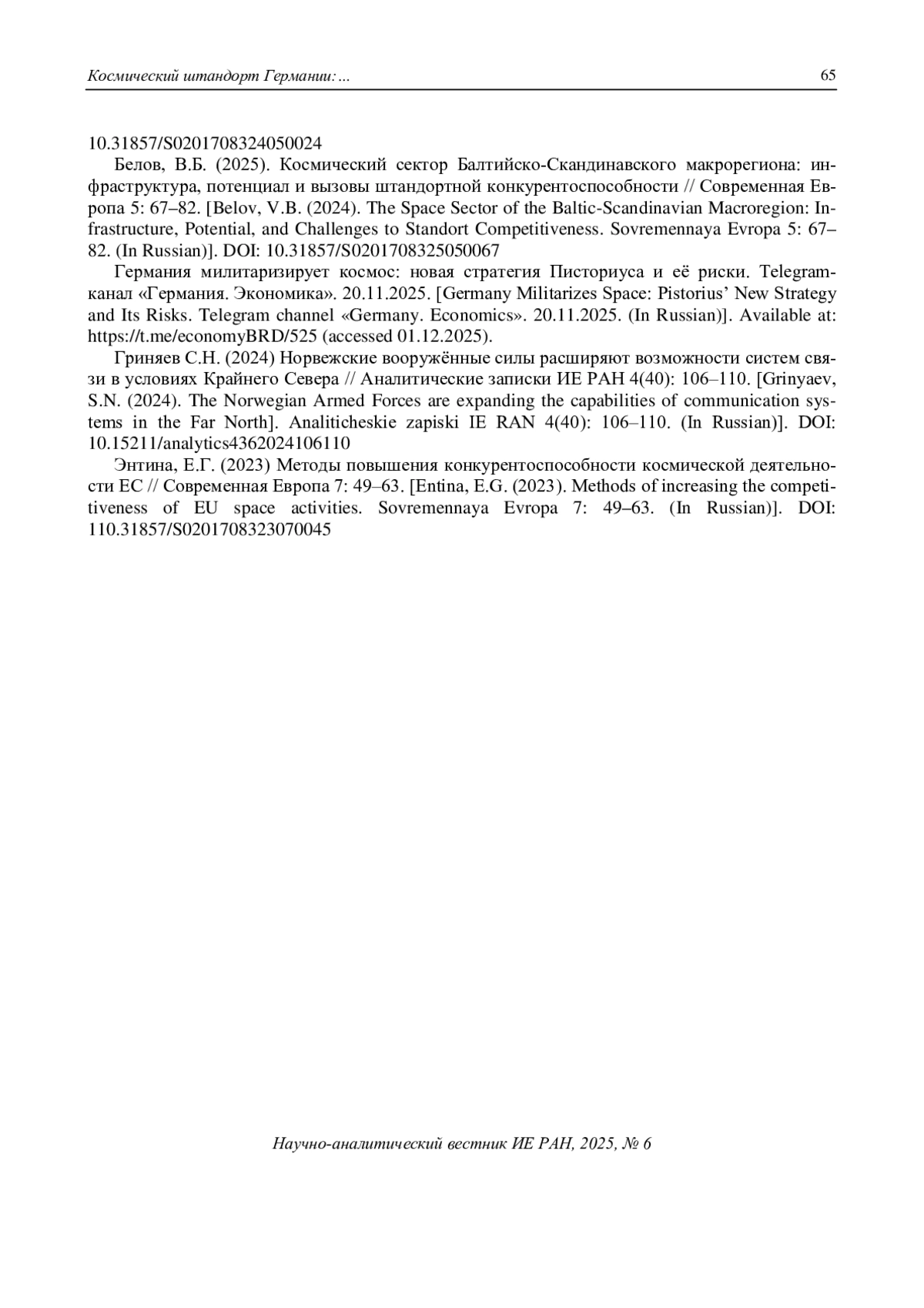 Germany Militarizes Space: Pistorius’ New Strategy and Its Risks. Telegram channel “Germany. Economics”. 20.11.2025. (In Russian). Available at: https://t.me/economyBRD/525 (accessed 01.12.2025).