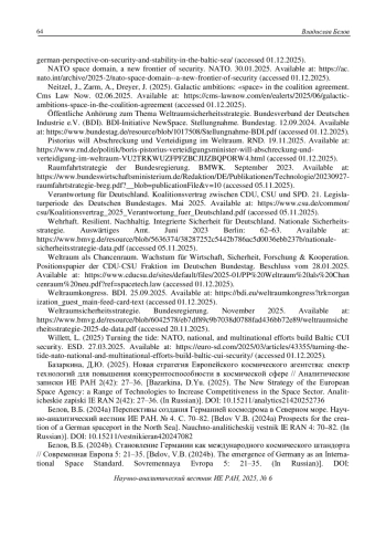 4. Clark, S. (2025). High above the equator, Russia is stalking satellites used by NATO armed forces. Arstechnica. 25.09.2025. Available at: https://arstechnica.com/space/2025/09/in-a-major-policy-shift-germany-considers-offensive-weapons-in-space/(accessed 01.12.2025).