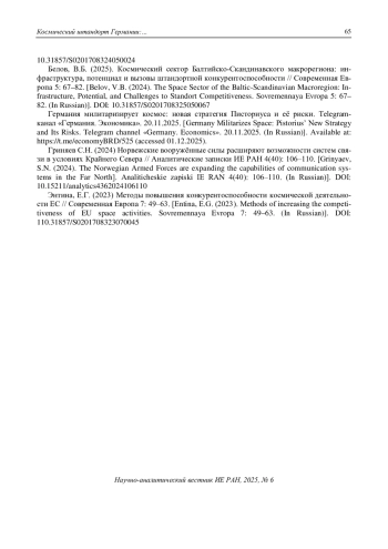 32. Белов, В.Б. (2025). Космический сектор Балтийско-Скандинавского макрорегиона: инфраструктура, потенциал и вызовы штандортной конкурентоспособности // Современная Европа 5: 67-82. EDN: KGQZPM