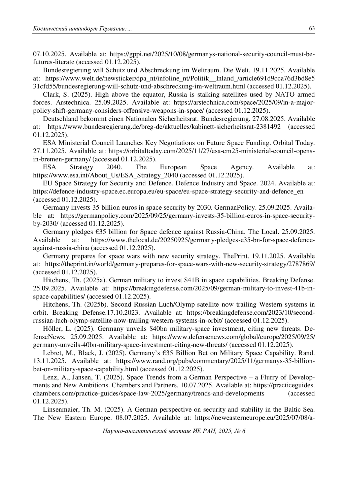 14. H?ller, L. (2025). Germany unveils $40bn military-space investment, citing new threats. DefenseNews. 25.09.2025. Available at: https://www.defensenews.com/global/europe/2025/09/25/germany-unveils-40bn-military-space-investment-citing-new-threats/(accessed 01.12.2025).