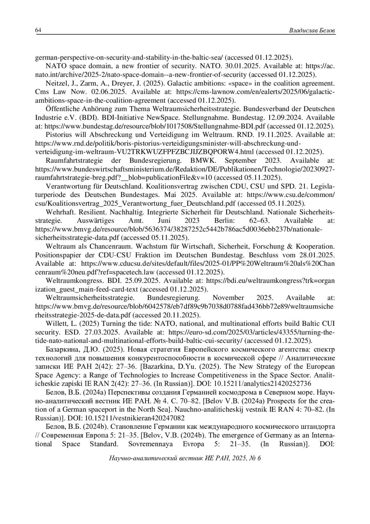 19. Neitzel, J., Zarm, A., Dreyer, J. (2025). Galactic ambitions: “space” in the coalition agreement. Cms Law Now. 02.06.2025. Available at: https://cms-lawnow.com/en/ealerts/2025/06/galactic-ambitions-space-in-the-coalition-agreement (accessed 01.12.2025).