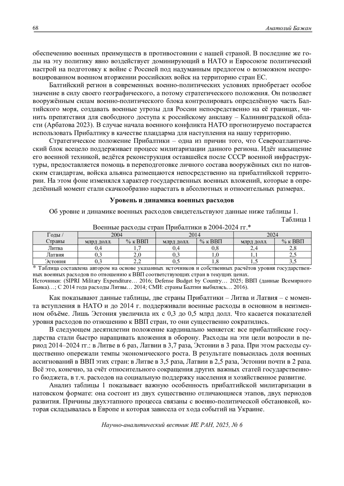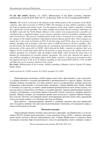 Настоящая статья посвящена анализу милитаризации экономик стран Прибалтики, после их вступления в НАТО в 2004 г. Исследована динамика государственных военных расходов, как в абсолютных, так и в относительных величинах. Для целей исследования военные расходы разделены на капитальные и текущие. Автор обосновывает положение, что стратегическая важность прибалтийского региона для Североатлантического альянса в контексте его подготовки к возможной войне с Россией оказывает существенное влияние на структуру, динамику и уровень военных расходов расположенных здесь государств. Процесс милитаризации в работе структурирован по двум этапам, отражающим ключевые изменения в военно-политическом противостоянии России и Запада. Эти изменения во многом связаны с событиями на Украине в 2014 г. На первом этапе (до 2014 г.) основная нагрузка по финансированию перевооружения и модернизации военной инфраструктуры региона ложилась на НАТО, что позволяло прибалтийским странам оптимизировать собственные бюджеты. На втором этапе (с 2014 г. по настоящее время) зафиксирован резкий рост объёма и уровня военных расходов, при этом бюджеты прибалтийских государств стали основным источником финансирования подготовки к возможным военным действиям. В работе также проанализировано влияние государственных военных расходов на дефицит бюджетов стран Прибалтики. Представлен прогноз эффекта воздействия на социально-экономическую ситуацию в регионе запланированного увеличения военных расходов до 5–6% к ВВП на период 2026–2030 гг
