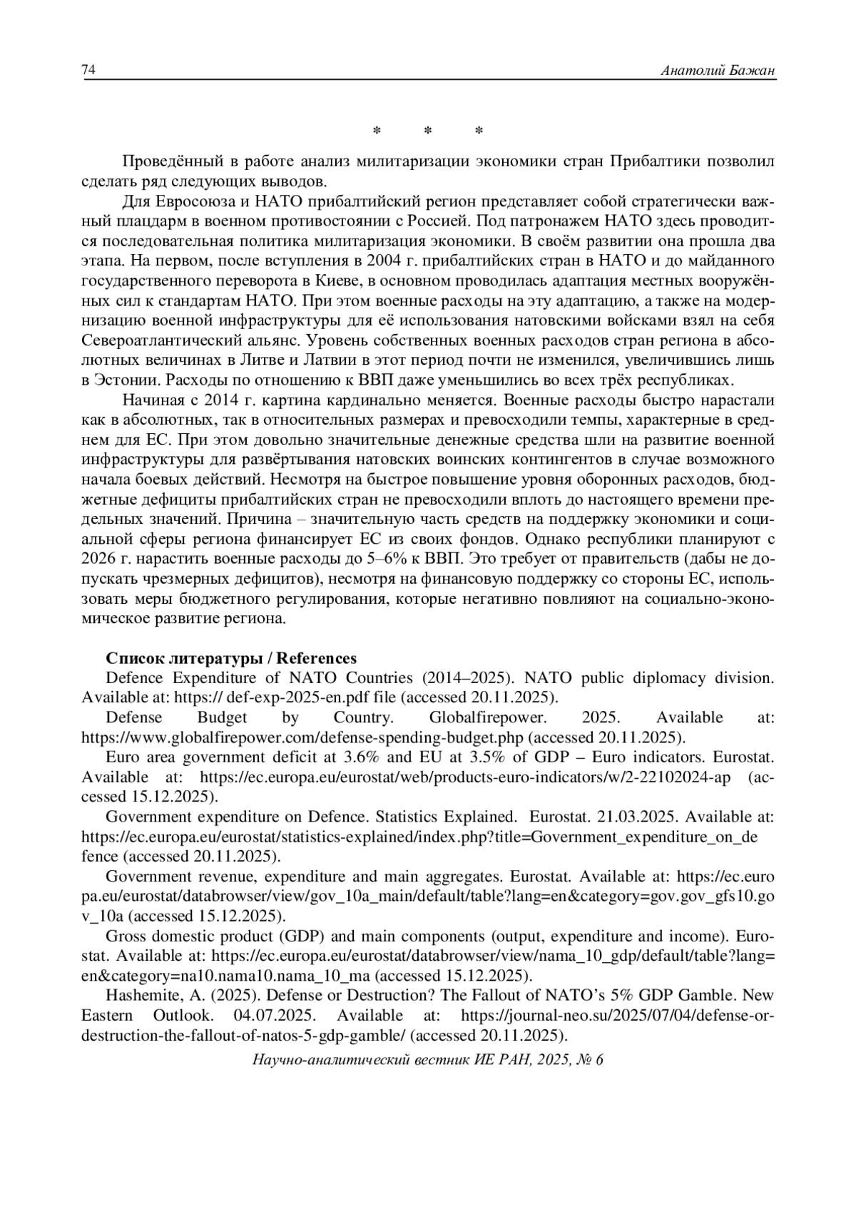 7. Hashemite, A. (2025). Defense or Destruction? The Fallout of NATO’s 5% GDP Gamble. New Eastern Outlook. 04.07.2025. Available at: https://journal-neo.su/2025/07/04/defense-or-destruction-the-fallout-of-natos-5-gdp-gamble/(accessed 20.11.2025).