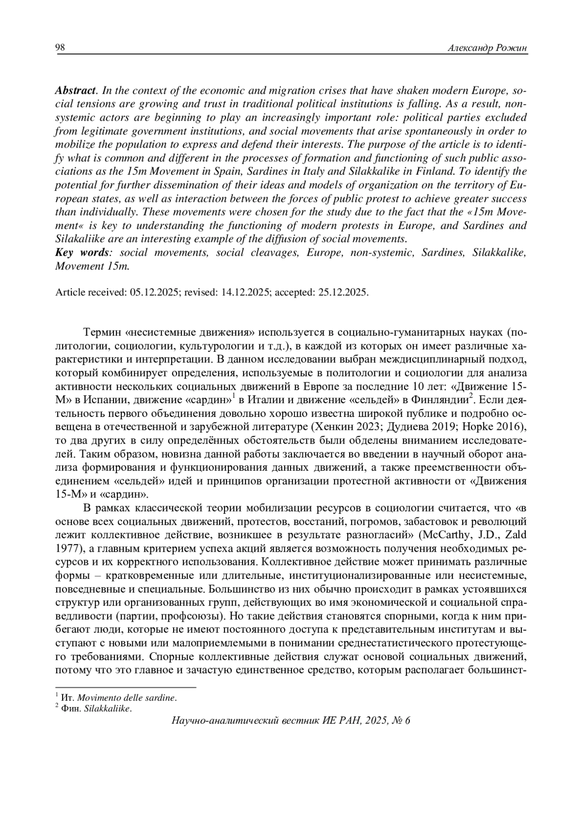 В условиях экономических, миграционных кризисов, которые потрясли современную Европу, растёт социальная напряжённость и падает доверие к традиционным политическим институтам. В результате всё большую роль начинают играть несистемные акторы: политические партии, не представленные в легитимных институтах власти, и общественные движения, которые возникают спонтанно с целью мобилизации населения для выражения и отстаивания своих интересов. Цель статьи – определить общее и различное в процессах формирования и функционирования таких общественных объединений, как «Движение 15-М» в Испании, движения «сардин» в Италии и «сельдей» в Финляндии; выявить потенциал для дальнейшего распространения их идей и моделей организации на территории европейских государств, а также взаимодействия между силами общественного протеста для достижения бóльших успехов. Указанные объекты были выбраны для исследования в силу того, что «Движение 15-М» является ключевым для понимания функционирования современных протестов в Европе, а «сардины» и «сельди» представляют собой пример диффузии социальных движений