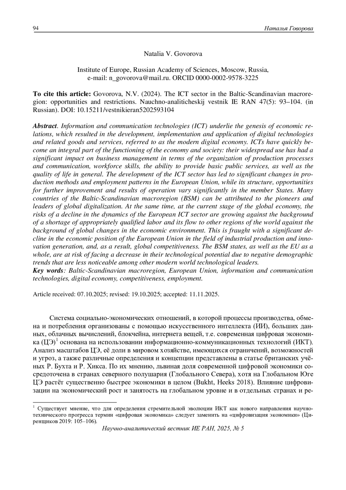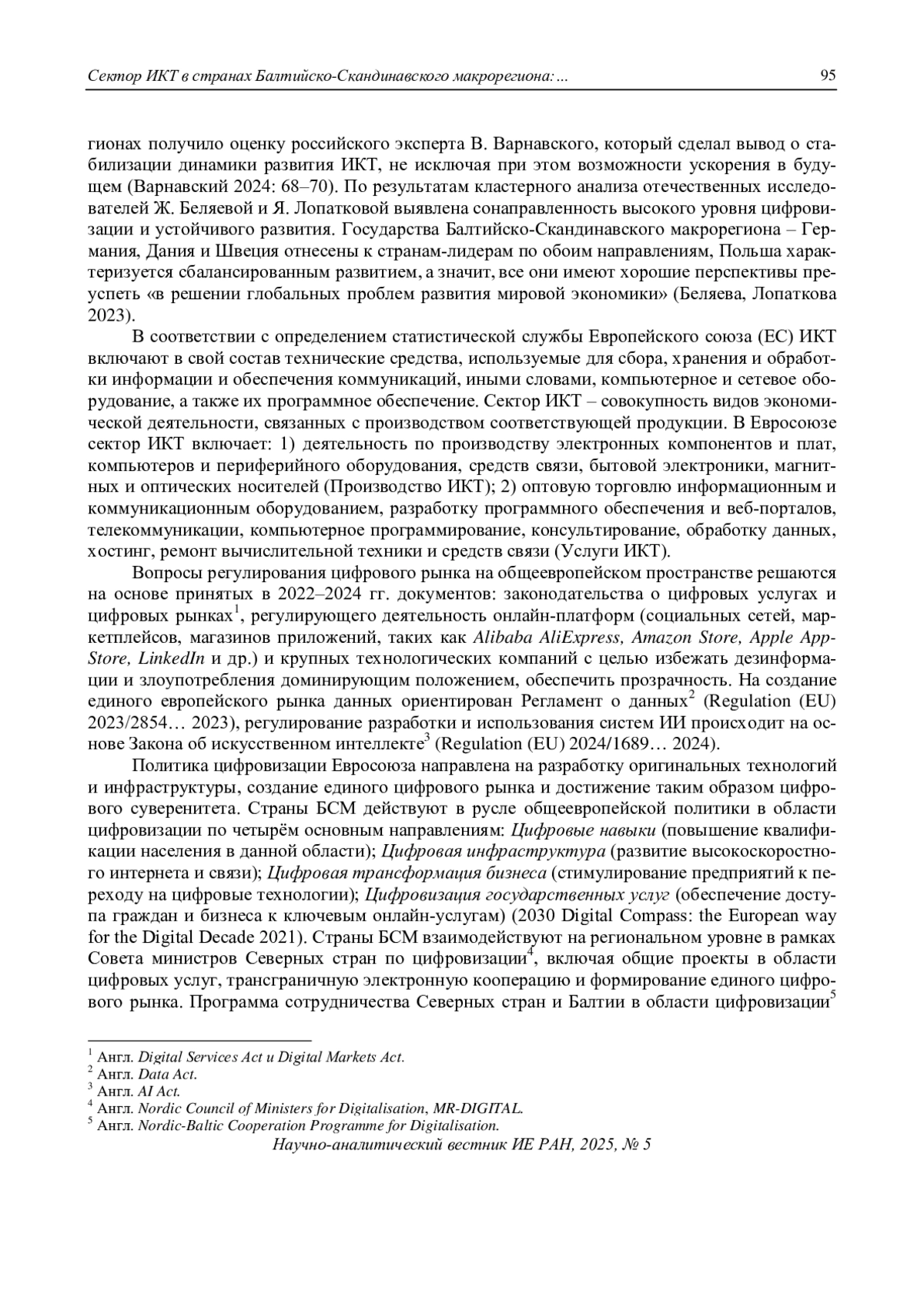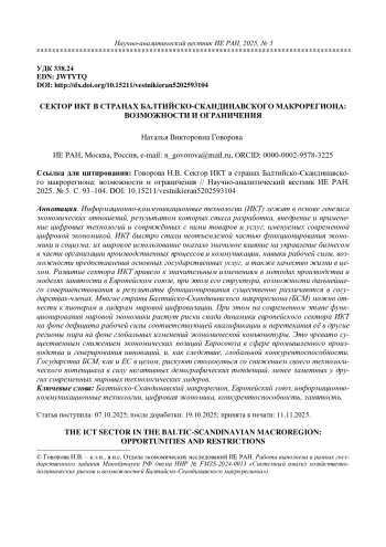 Информационно-коммуникационные технологии (ИКТ) лежат в основе генезиса экономических отношений, результатом которых стала разработка, внедрение и применение цифровых технологий и сопряжённых с ними товаров и услуг, именуемых современной цифровой экономикой. ИКТ быстро стали неотъемлемой частью функционирования экономики и социума: их широкое использование оказало значимое влияние на управление бизнесом в части организации производственных процессов и коммуникации, навыки рабочей силы, возможности предоставления основных государственных услуг, а также качество жизни в целом. Развитие сектора ИКТ привело к значительным изменениям в методах производства и моделях занятости в Европейском союзе, при этом его структура, возможности дальнейшего совершенствования и результаты функционирования существенно различаются в государствах-членах. Многие страны Балтийско-Скандинавского макрорегиона (БСМ) можно отнести к пионерам и лидерам мировой цифровизации. При этом на современном этапе функционирования мировой экономики растут риски спада динамики европейского сектора ИКТ на фоне дефицита рабочей силы соответствующей квалификации и перетекания её в другие регионы мира на фоне глобальных изменений экономической конъюнктуры. Это чревато существенным снижением экономических позиций Евросоюза в сфере промышленного производства и генерирования инноваций, и, как следствие, глобальной конкурентоспособности. Государства БСМ, как и ЕС в целом, рискуют столкнуться со снижением своего технологического потенциала в силу негативных демографических тенденций, менее заметных у других современных мировых технологических лидеров