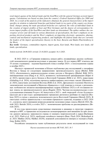 В статье исследована специфика товарного импорта восточных и западных земель Германии. Специализация определяется путём сравнения отраслевых импортных квот федеральных земель и Востока/Запада с отраслевыми импортными квотами ФРГ. Расчёты основаны на данных Федерального статистического ведомства страны за 2008 и 2024 гг. В результате анализа полученных индикаторов сформулированы общие характеристики импортной специфики, сложившиеся в двух частях страны, рассмотрены изменения среди основных отраслей, определена роль отдельных земель в создании импортного профиля Восточной и Западной Германии. Автор показывает уровень новых и старых земель в различных видах специализации, акцент Востока на импорте электротехнической продукции и Запада – на импорте электронной, автомобильной, фармацевтической и машиностроительной продукции. Выделены федеральные земли – лидеры импортной специализации – Саксония на Востоке, Бавария и Баден-Вюртемберг на Западе