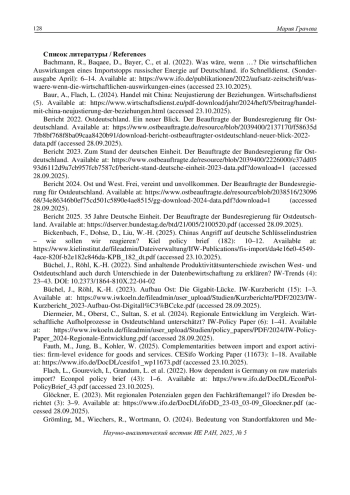 1. Bachmann, R., Baqaee, D., Bayer, C., et al. (2022). Was wäre, wenn …? Die wirtschaftlichen Auswirkungen eines Importstopps russischer Energie auf Deutschland. ifo Schnelldienst. (Sonderausgabe April): 6-14. Available at: https://www.ifo.de/publikationen/2022/aufsatz-zeitschrift/was-waere-wenn-die-wirtschaftlichen-auswirkungen-eines (accessed 23.10.2025).