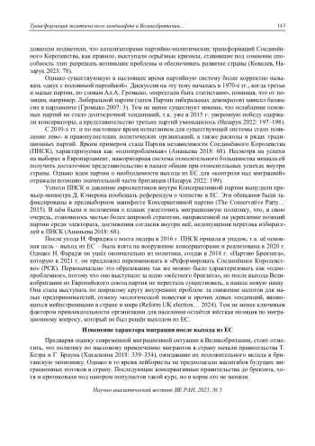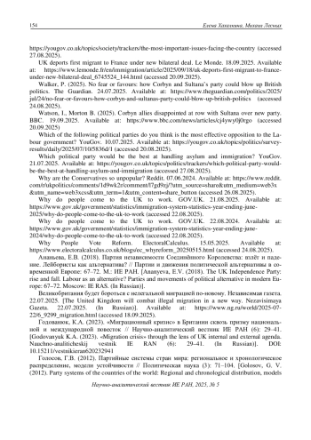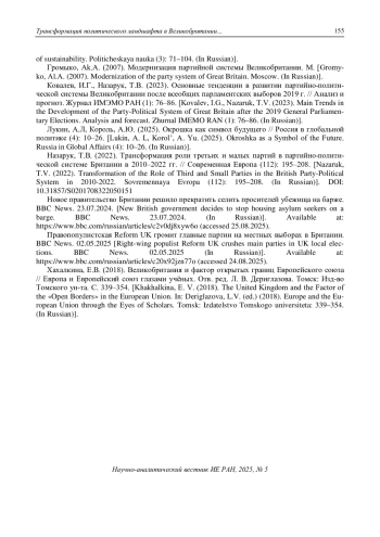 61. Назарук, Т.В. (2022). Трансформация роли третьих и малых партий в партийно-политической системе Британии в 2010-2022 гг. // Современная Европа (112): 195-208. EDN: GNWIYE