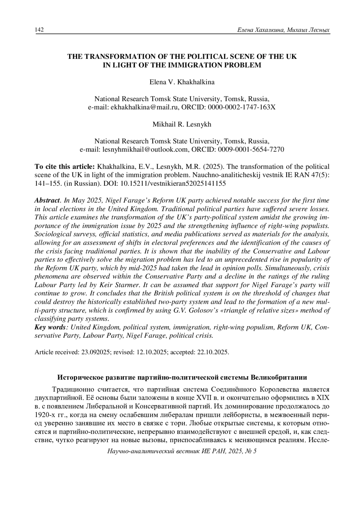 В мае 2025 г. на местных выборах в Великобритании впервые в истории достигла заметного успеха партия «Реформировать Соединённое Королевство» Н. Фараджа. Традиционные политические партии понесли серьёзные потери. В статье рассматриваются процессы трансформации партийно-политической системы Великобритании в связи с ростом значимости иммиграционного вопроса к 2025 г. и укрепления влияния правых популистов. Материалами для анализа послужили социологические опросы, официальная статистика и публикации в СМИ, что позволяет оценить сдвиги в электоральных предпочтениях и определить причины кризиса традиционных партий. Показано, что неспособность Консервативной и Лейбористской партий эффективно решить проблему миграции привела к беспрецедентному росту популярности партии «Реформировать Соединённое Королевство», которая к середине 2025 г. стала лидировать в опросах общественного мнения. Параллельно наблюдаются кризисные явления в Консервативной партии и падение рейтингов правящих лейбористов во главе с К. Стармером. Можно предположить, что поддержка партии Н. Фараджа будет возрастать. Сделан вывод, что британская политическая система находится на пороге изменений, которые способны разрушить исторически сложившуюся двухпартийность и привести к формированию новой многопартийной структуры, что подтверждается при использовании метода классификации партийных систем «треугольником относительных размеров» Г. В. Голосова.