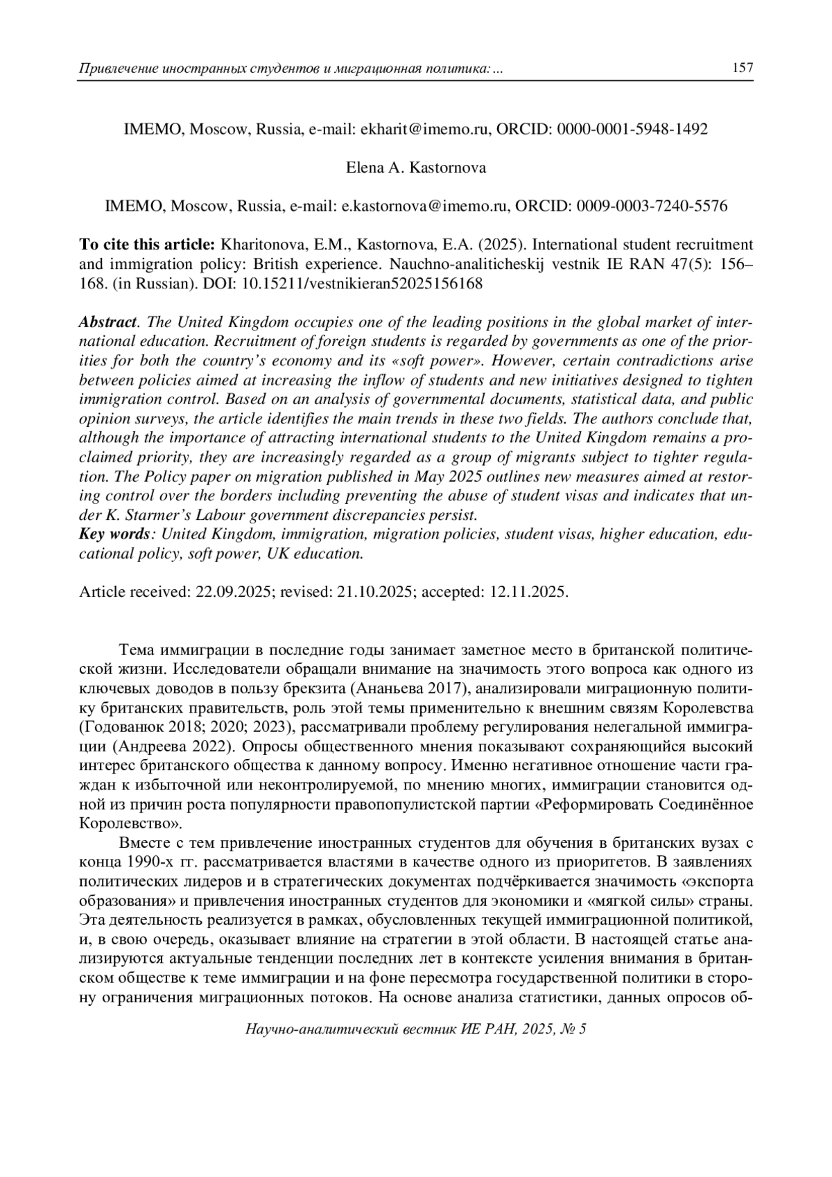 Великобритания занимает одну из лидерских позиций на глобальном рынке международного образования. Привлечение в страну студентов из-за рубежа считается значимым для экономики и «мягкой силы» страны. Однако существуют определённые противоречия между политикой, направленной на привлечение всё большего числа студентов, и новыми инициативами, усиливающими контроль над иммиграцией. В статье на основании анализа правительственных документов, статистики и данных опросов общественного мнения выявляются основные тенденции последних лет в двух указанных сферах. Авторы делают вывод о том, что при сохранении риторики о значимости привлечения иностранных студентов в Соединённое Королевство (СК), заметно усиление внимания к ним как к одной из категорий иммигрантов, в отношении которых необходим более жёсткий контроль. Опубликованный в мае 2025 г. стратегический документ, анонсирующий наведение порядка в сфере миграции и предусматривающий, в частности, предотвращение злоупотреблений студенческими визами, свидетельствует о том, что при правительстве лейбористов К. Стармера указанные расхождения сохраняются