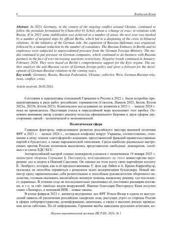 Состояние и перспективы отношений Германии и России в 2022 г. были подробно проанализированы в ряде работ российских германистов (Соколов, Панков 2023; Белов, Котов 2023а, 2023b; Котов 2023). Комплексное исследование их развития в 2023 г. – начале 2024 г. пока не проводилось. Настоящая статья в определённой мере восполняет этот пробел. Основное внимание автор уделяет анализу подхода официального Берлина к двум сферам двусторонних связей – политической и экономической