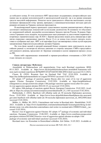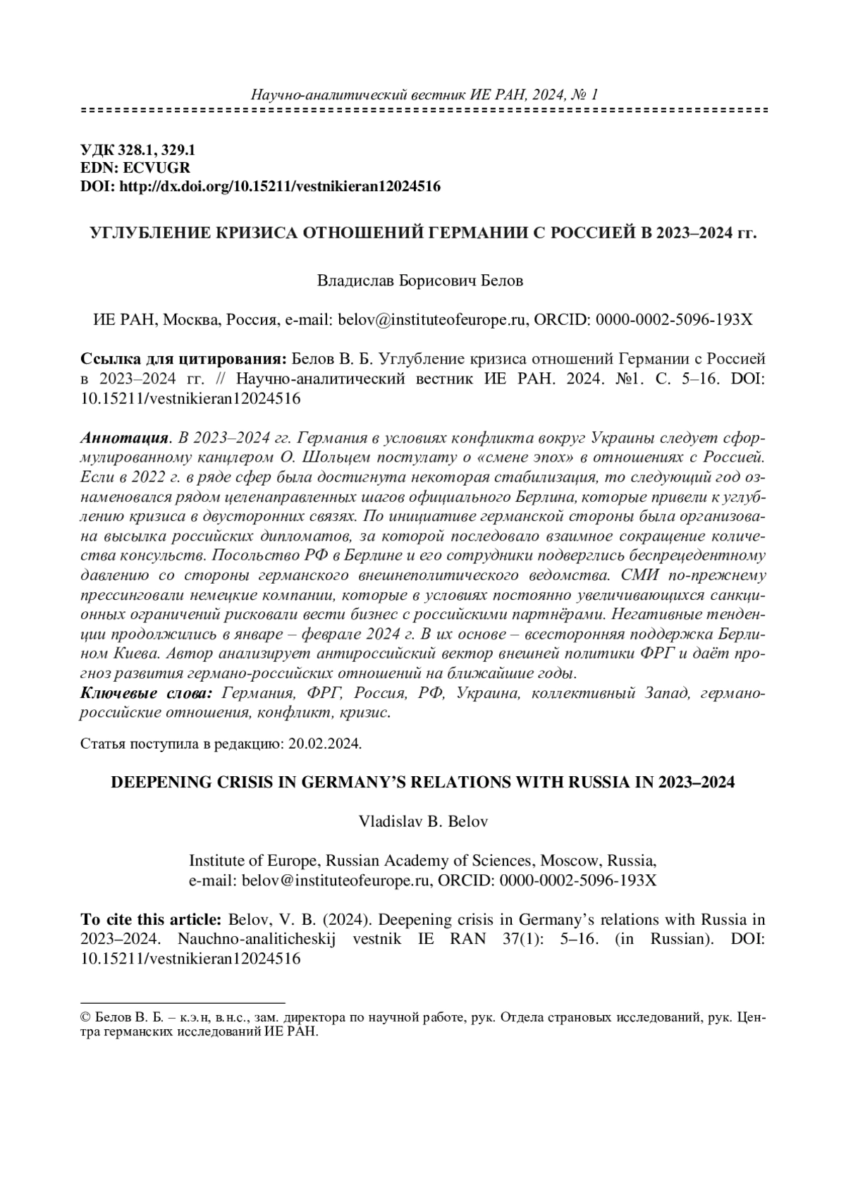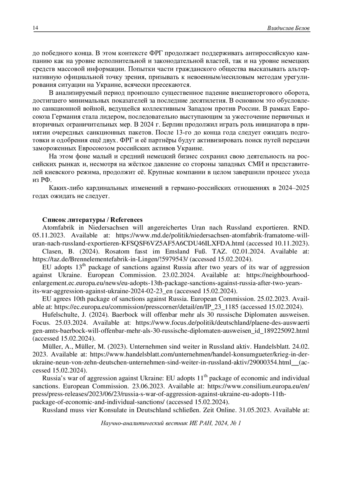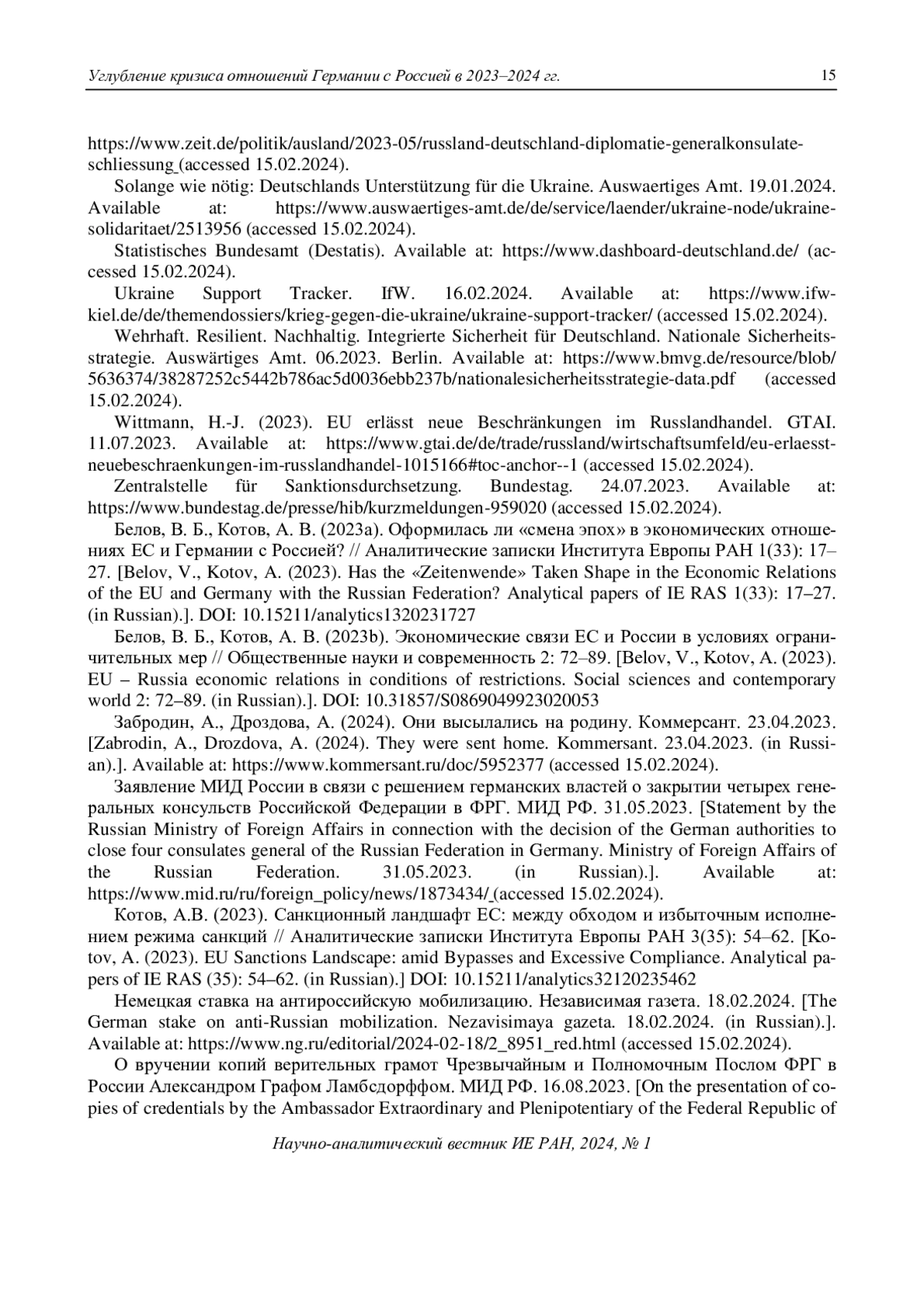 15. Белов, В. Б., Котов, А. В. (2023а). Оформилась ли “смена эпох” в экономических отношениях ЕС и Германии с Россией? // Аналитические записки Института Европы РАН 1(33): 17-27. EDN: YCYCKJ