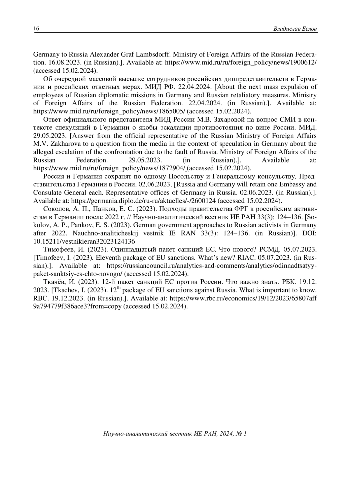 25. Соколов, А. П., Панков, Е. С. (2023). Подходы правительства ФРГ к российским активистам в Германии после 2022 г. // Научно-аналитический вестник ИЕ РАН 33(3): 124-136. EDN: XPNHMA