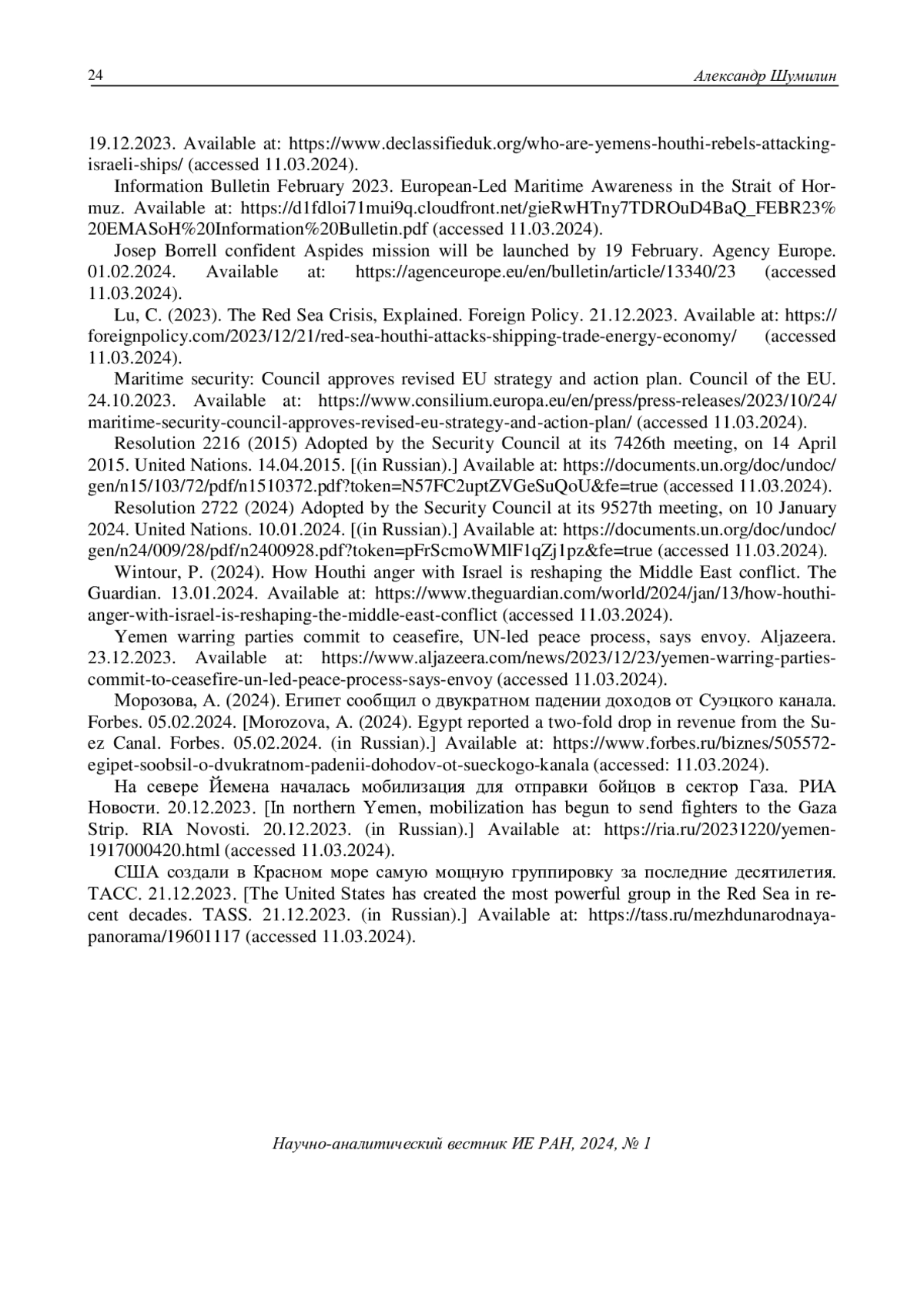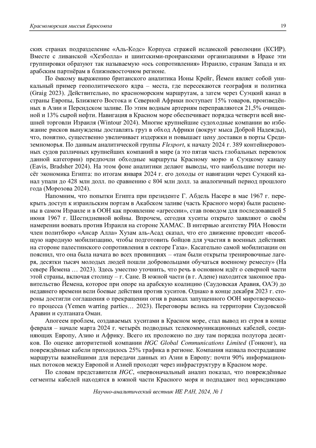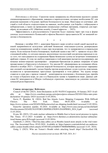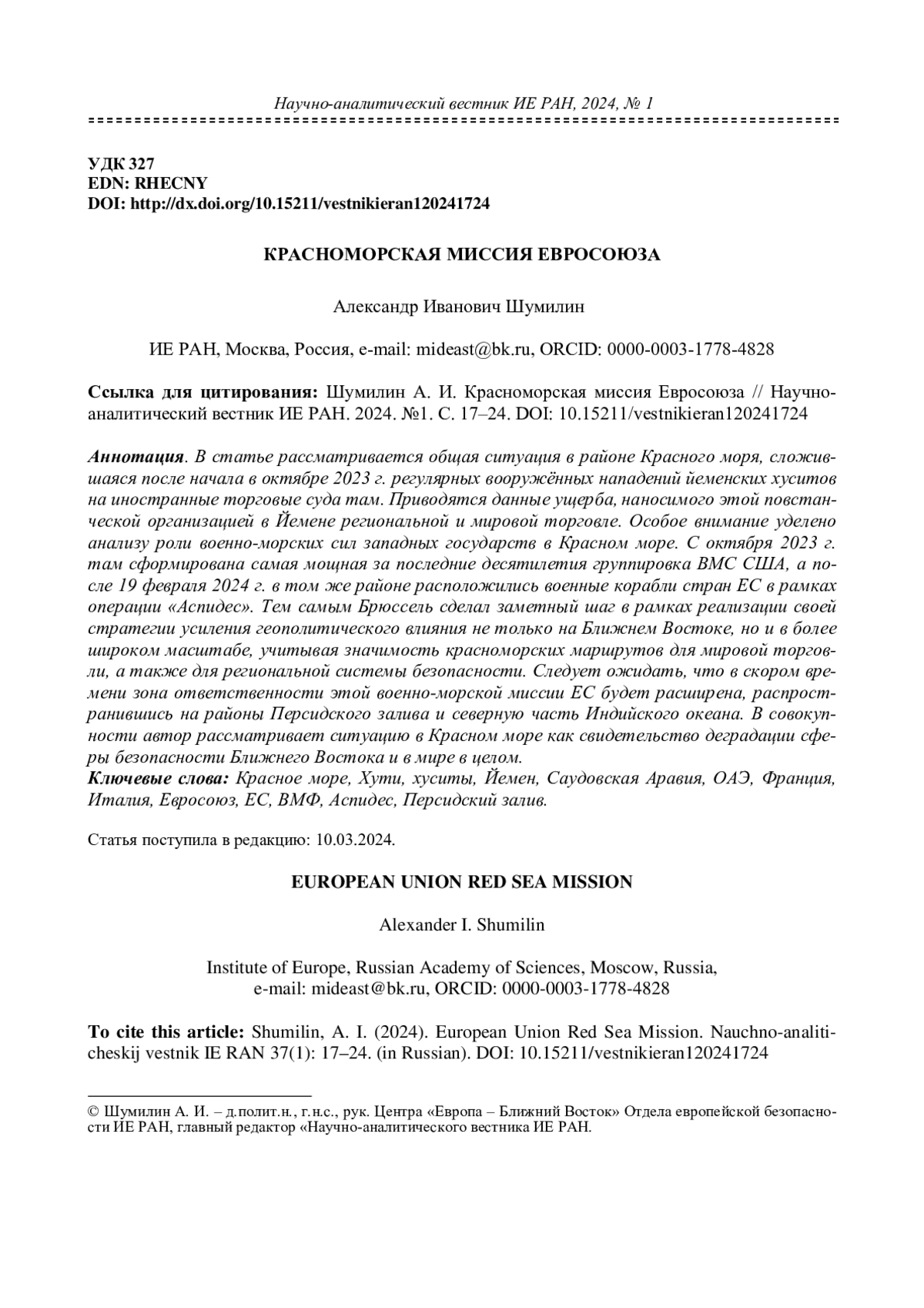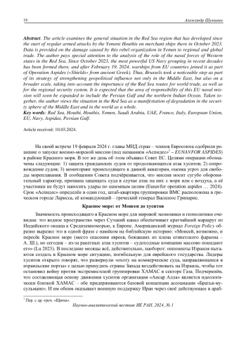В статье рассматривается общая ситуация в районе Красного моря, сложившаяся после начала в октябре 2023 г. регулярных вооружённых нападений йеменских хуситов на иностранные торговые суда там. Приводятся данные ущерба, наносимого этой повстанческой организацией в Йемене региональной и мировой торговле. Особое внимание уделено анализу роли военно-морских сил западных государств в Красном море. С октября 2023 г. там сформирована самая мощная за последние десятилетия группировка ВМС США, а после 19 февраля 2024 г. в том же районе расположились военные корабли стран ЕС в рамках операции «Аспидес». Тем самым Брюссель сделал заметный шаг в рамках реализации своей стратегии усиления геополитического влияния не только на Ближнем Востоке, но и в более широком масштабе, учитывая значимость красноморских маршрутов для мировой торговли, а также для региональной системы безопасности. Следует ожидать, что в скором времени зона ответственности этой военно-морской миссии ЕС будет расширена, распространившись на районы Персидского залива и северную часть Индийского океана. В совокупности автор рассматривает ситуацию в Красном море как свидетельство деградации сферы безопасности Ближнего Востока и в мире в целом