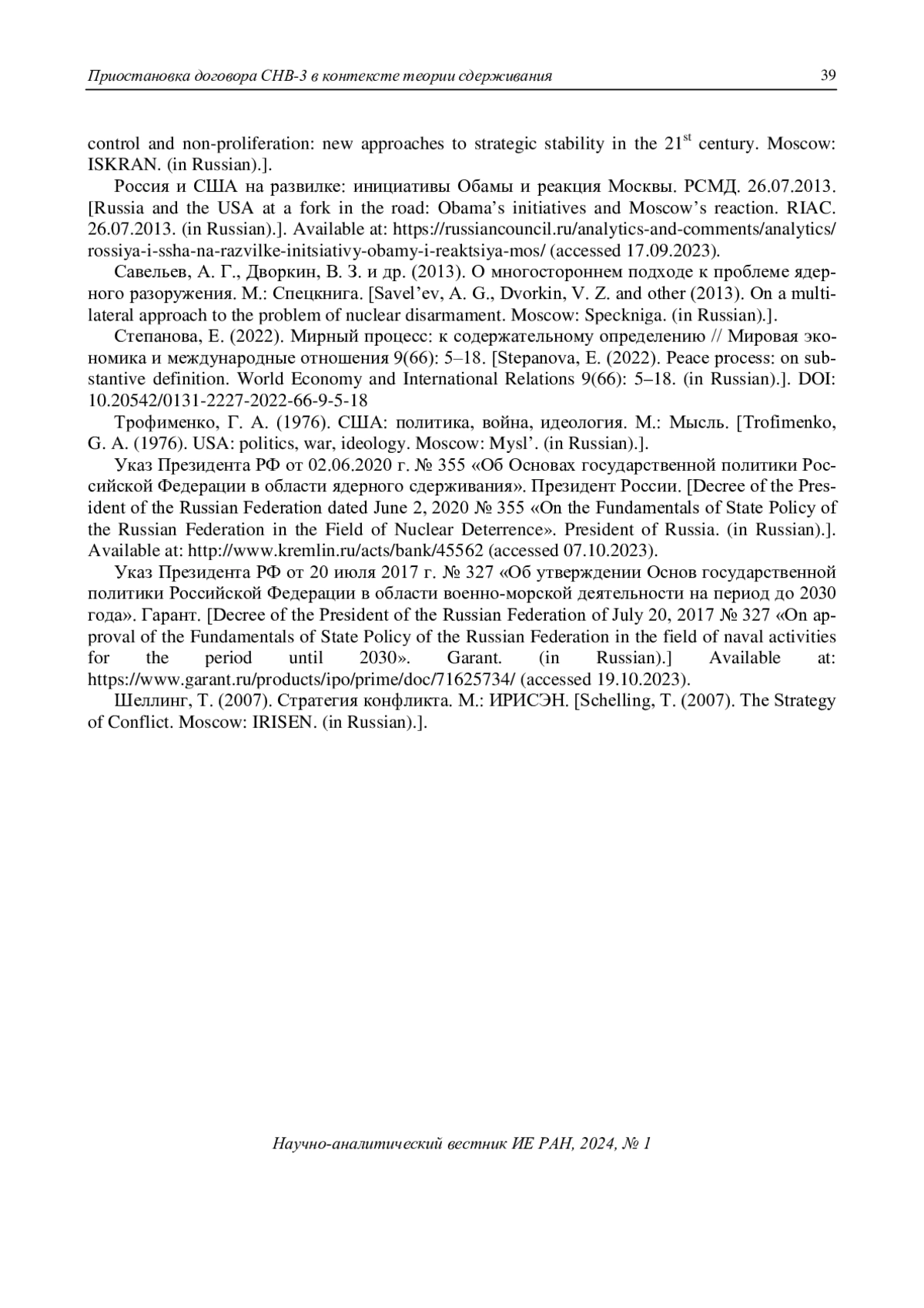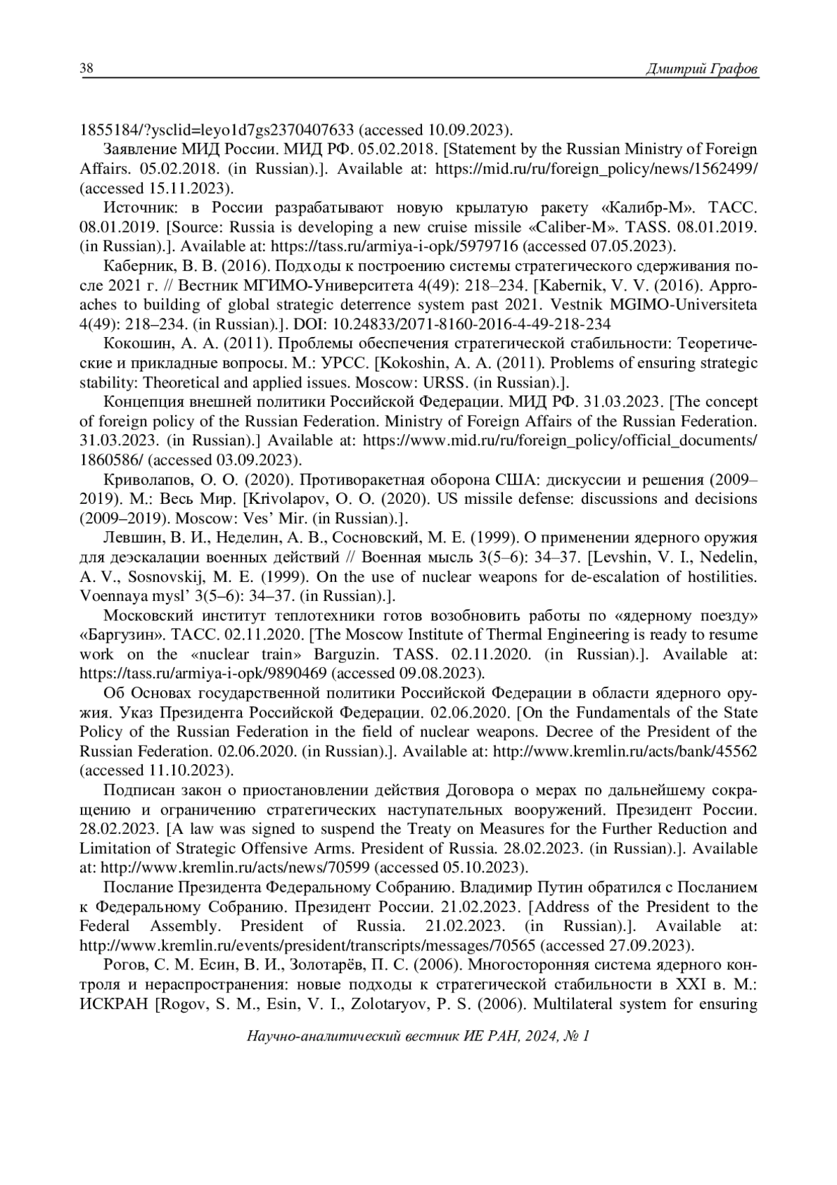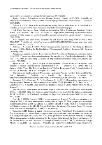 33. Каберник, В. В. (2016). Подходы к построению системы стратегического сдерживания после 2021 г. // Вестник МГИМО-Университета 4(49): 218-234. EDN: WXOKMD
