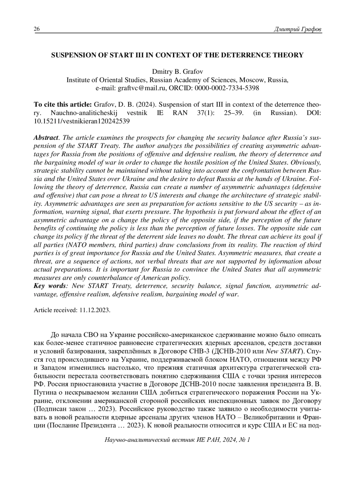 После начала специальной военной операции (СВО) РФ на Украине и приостановки участия РФ в Договоре СНВ-3 (СНВ-2010)1 кризис в отношениях России с США и ЕС углубился настолько, что стратегическое сдерживание не может рассматриваться отдельно от стремления Запада нанести руками Украины поражение России посредством поставок оружия и другой военной помощи. В статье анализируются меры, принятые РФ, как сигналы Вашингтону и Брюсселю с точки зрения теории сдерживания, а также возможности создания асимметричных преимуществ (АП) для РФ с позиций наступательного/оборонительного реализма и «переговорной модели войны». АП рассматривается автором в первую очередь как информация, получаемая противником и выполняющая функцию «сигнального» давления (предупреждения). Выдвигается гипотеза о влиянии АП на изменение политики противоположной стороны через восприятие меньшей безопасности, что приводит к необходимости договариваться о новом статус-кво с учётом изменившегося баланса сил. Исследование позволяет оценить возможности РФ для защиты национальных интересов, в том числе при подготовке нового договора по СНВ. В теоретической плоскости работа представляет собой комплексное рассмотрение асимметричных преимуществ в «переговорной модели войны». В практическом плане она может быть полезна при выработке дипломатических и военно-политических мер с целью убедить США и НАТО в том, что создание АП в широком диапазоне – от «неудобств» и угроз интересам до изменений в архитектуре стратегической стабильности – не является блефом