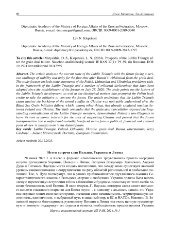 В статье проведён анализ текущего состояния форума «Люблинского треугольника», который после выхода России из «зерновой сделки» впервые столкнулся с серьёзным испытанием на устойчивость и единство. Рассмотрены как некоторые заявления президентов Польши, Литвы и Украины в рамках данного формата, так и ряд трёхсторонних деклараций. По мнению авторов, статус «Люблинского треугольника» на фоне вооружённого конфликта на Украине был заметно подорван после провала «черноморской инициативы», что вызвало напряжённость в отношениях между Варшавой и Киевом. Аннулирование «зерновой сделки» обнажило давние противоречия участников «Люблинского треугольника», продемонстрировало нежелание Польши ущемлять свои собственные экономические интересы ради поддержки Украины. Авторы сделали вывод о том, что трансформация указанного форума во взаимовыгодный с политической, финансовой и культурной точек зрения союз маловероятна даже в отдалённой перспективе
