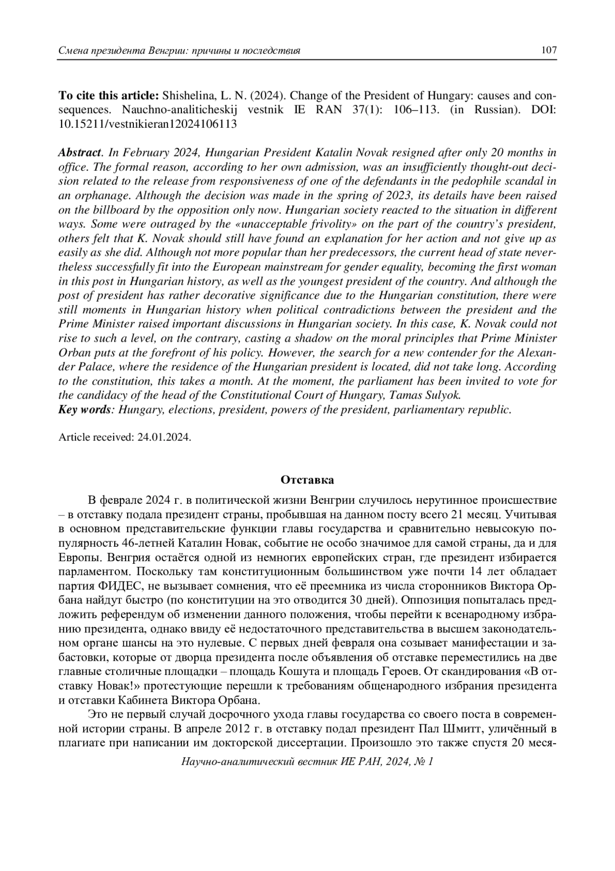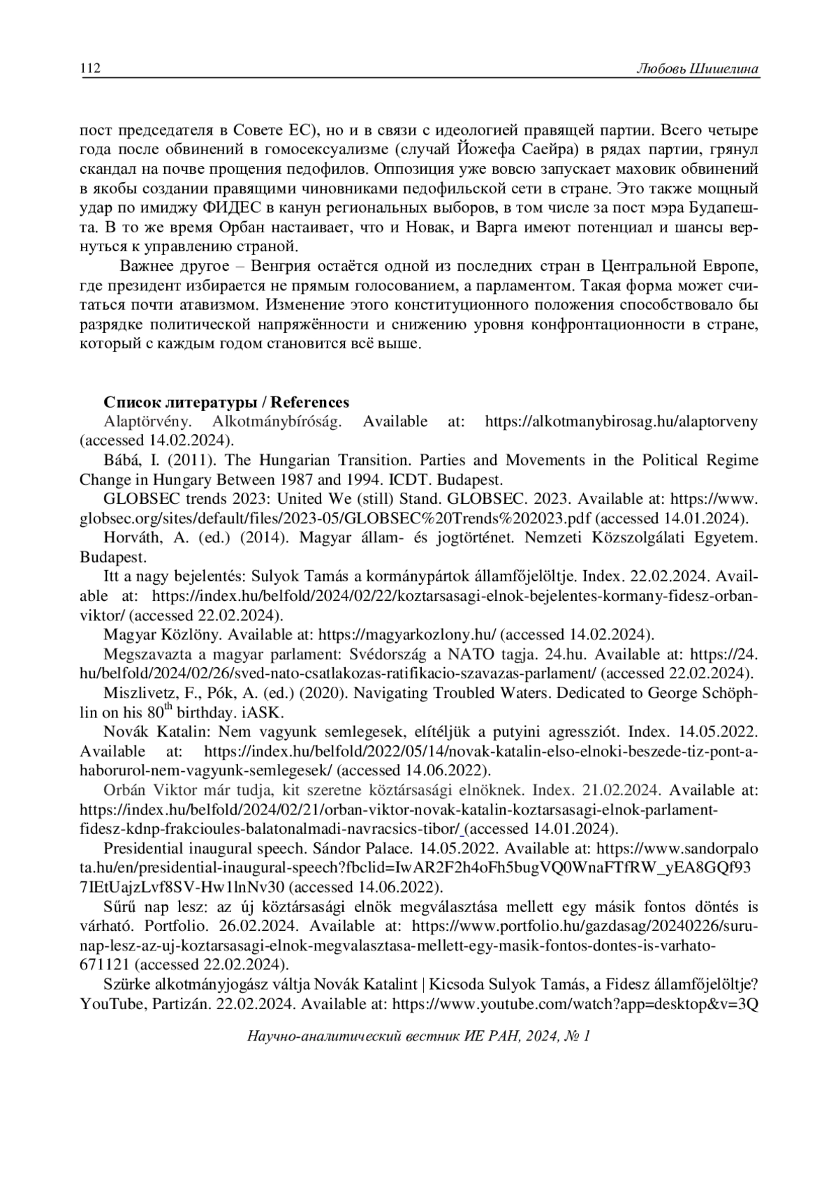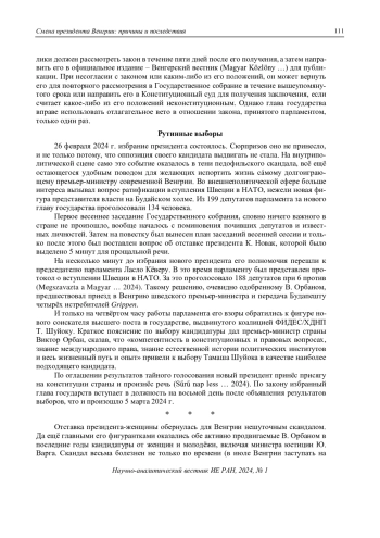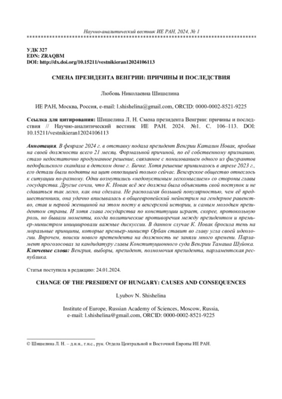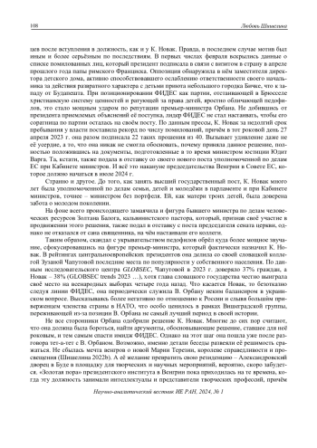 В феврале 2024 г. в отставку подала президент Венгрии Каталин Новак, пробыв на своей должности всего 21 месяц. Формальной причиной, по её собственному признанию, стало недостаточно продуманное решение, связанное с помилованием одного из фигурантов педофильского скандала в детском доме г. Бичке. Хотя решение принималось в апреле 2023 г., его детали были подняты на щит оппозицией только сейчас. Венгерское общество отнеслось к ситуации по-разному. Одни возмутились «недопустимым легкомыслием» со стороны главы государства. Другие сочли, что К. Новак всё же должна была объяснить свой поступок и не сдаваться так легко, как она сделала. Не располагая большей популярностью, чем её предшественники, она удачно вписывалась в общеевропейский мейнстрим на гендерное равенство, став и первой женщиной на этом посту в венгерской истории, и самым молодым президентом страны. И хотя глава государства по конституции играет, скорее, протокольную роль, но бывали моменты, когда политические противоречия между президентом и премьер-министром инициировали важные дискуссии. В данном случае К. Новак бросила тень на моральные принципы, которые премьер-министр Орбан ставит во главу угла своей идеологии. Впрочем, поиски нового претендента на должность не заняли много времени. Парламент проголосовал за кандидатуру главы Конституционного суда Венгрии Тамаша Шуйока