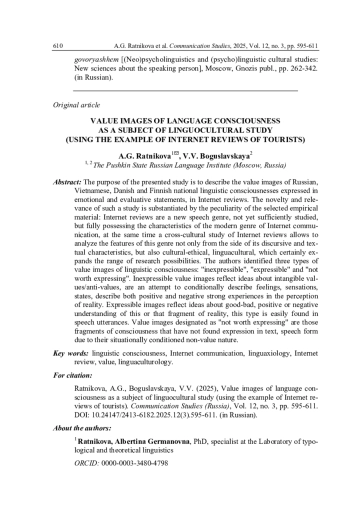 В статье дается описание ценностных образов русского, вьетнамского, датского и финского национальных языковых сознаний, выраженных в эмоционально-оценочных высказываниях в интернет-отзывах. Новизна и актуальность такого исследования обосновывается особенностью выбранного эмпирического материала: интернет-отзывы являются новым речевым жанром, еще не достаточно изученным, но в полной мере обладающим характеристиками современного жанра интернет-коммуникации, а кросс-культурное исследование интернет-отзывов позволяет анализировать особенности этого жанра не только со стороны его дискурсивных и текстовых характеристик, но и культурно-этических, лингвокультурологических, что безусловно расширяет диапазон познавательных возможностей. Авторами были выделены три типа ценностных образов языкового сознания: «невыразимые», «выразимые» и «не стоящие выражения». Невыразимые ценностные образы отражают представления о нематериальных ценностях / антиценностях, являются попыткой условного описания чувств, ощущений, состояний, описывают как положительные, так и отрицательные сильные переживания при восприятии действительности. Выразимые образы отражают представления о хорошем / плохом, позитивном или негативном осмыслении того или иного фрагмента действительности, с легкостью обнаруживаются в речевых высказываниях. Ценностные образы, обозначенные как «не стоящие выражения», - это те фрагменты сознания, которые не нашли выражения в текстовой, речевой форме ввиду своей ситуативно обусловленной условно не ценностной природы